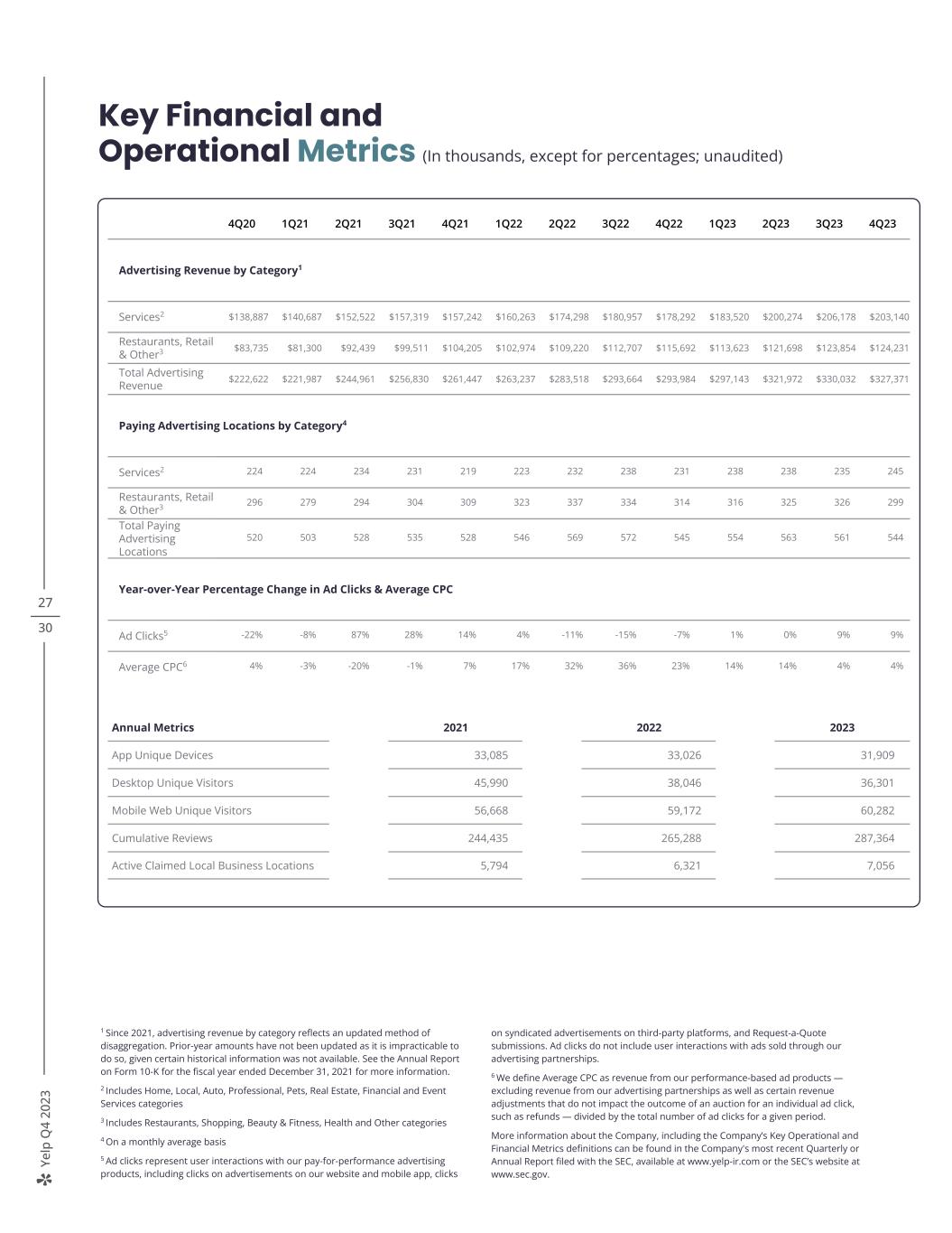 Ye lp Q 4 20 23 27 30 Key Financial and Operational Metrics (In thousands, except for percentages; unaudited) 4Q20 1Q21 2Q21 3Q21 4Q21 1Q22 2Q22 3Q22 4Q22 1Q23 2Q23 3Q23 4Q23 Advertising Revenue by Category1 Services2 $138,887 $140,687 $152,522 $157,319 $157,242 $160,263 $174,298 $180,957 $178,292 $183,520 $200,274 $206,178 $203,140 Restaurants, Retail & Other3 $83,735 $81,300 $92,439 $99,511 $104,205 $102,974 $109,220 $112,707 $115,692 $113,623 $121,698 $123,854 $124,231 Total Advertising Revenue $222,622 $221,987 $244,961 $256,830 $261,447 $263,237 $283,518 $293,664 $293,984 $297,143 $321,972 $330,032 $327,371 Paying Advertising Locations by Category4 Services2 224 224 234 231 219 223 232 238 231 238 238 235 245 Restaurants, Retail & Other3 296 279 294 304 309 323 337 334 314 316 325 326 299 Total Paying Advertising Locations 520 503 528 535 528 546 569 572 545 554 563 561 544 Year-over-Year Percentage Change in Ad Clicks & Average CPC Ad Clicks5 -22% -8% 87% 28% 14% 4% -11% -15% -7% 1% 0% 9% 9% Average CPC6 4% -3% -20% -1% 7% 17% 32% 36% 23% 14% 14% 4% 4% 1 Since 2021, advertising revenue by category reflects an updated method of disaggregation. Prior-year amounts have not been updated as it is impracticable to do so, given certain historical information was not available. See the Annual Report on Form 10-K for the fiscal year ended December 31, 2021 for more information. 2 Includes Home, Local, Auto, Professional, Pets, Real Estate, Financial and Event Services categories 3 Includes Restaurants, Shopping, Beauty & Fitness, Health and Other categories 4 On a monthly average basis 5 Ad clicks represent user interactions with our pay-for-performance advertising products, including clicks on advertisements on our website and mobile app, clicks on syndicated advertisements on third-party platforms, and Request-a-Quote submissions. Ad clicks do not include user interactions with ads sold through our advertising partnerships. 6 We define Average CPC as revenue from our performance-based ad products — excluding revenue from our advertising partnerships as well as certain revenue adjustments that do not impact the outcome of an auction for an individual ad click, such as refunds — divided by the total number of ad clicks for a given period. More information about the Company, including the Company’s Key Operational and Financial Metrics definitions can be found in the Company's most recent Quarterly or Annual Report filed with the SEC, available at www.yelp-ir.com or the SEC’s website at www.sec.gov. Annual Metrics 2021 2022 2023 App Unique Devices 33,085 33,026 31,909 Desktop Unique Visitors 45,990 38,046 36,301 Mobile Web Unique Visitors 56,668 59,172 60,282 Cumulative Reviews 244,435 265,288 287,364 Active Claimed Local Business Locations 5,794 6,321 7,056