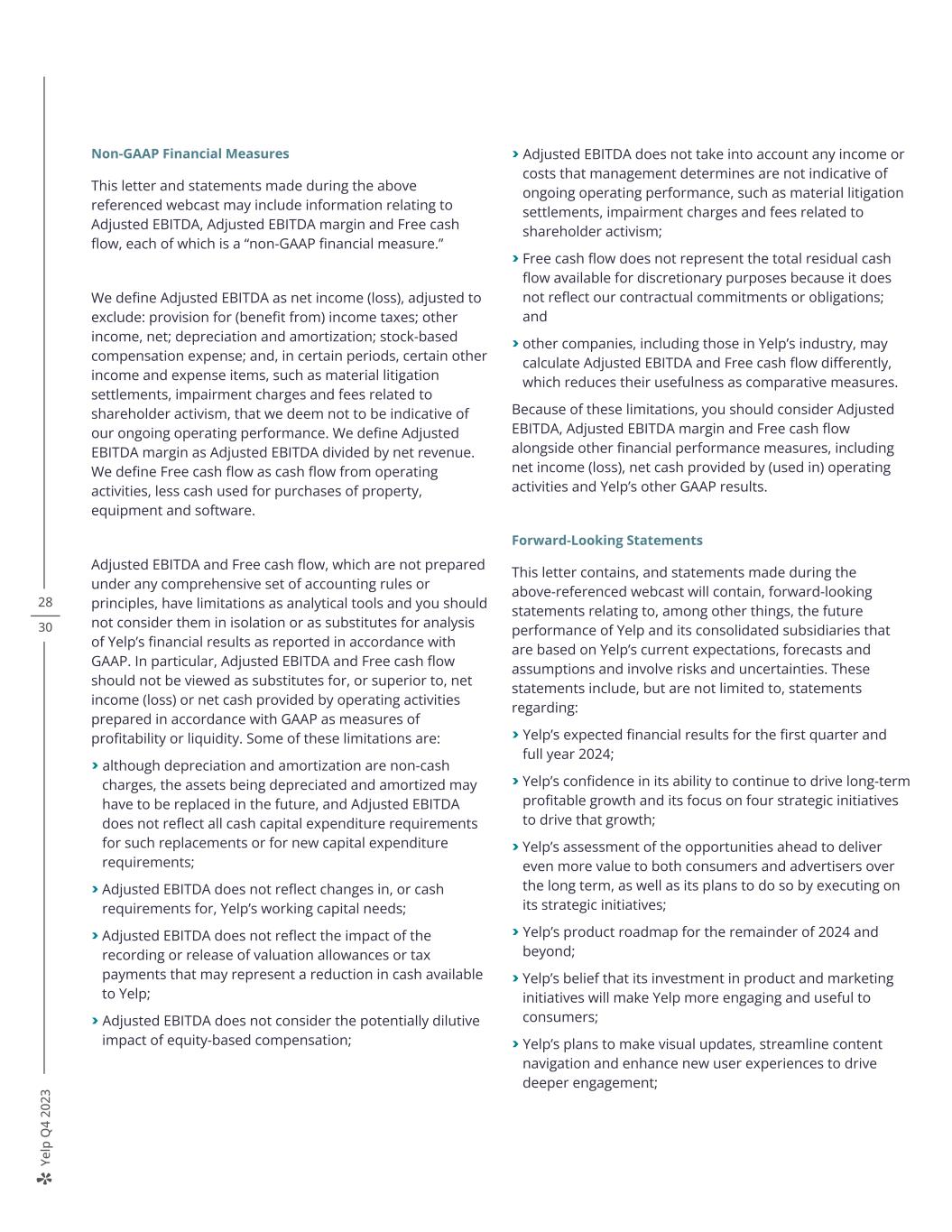 Ye lp Q 4 20 23 Non-GAAP Financial Measures This letter and statements made during the above referenced webcast may include information relating to Adjusted EBITDA, Adjusted EBITDA margin and Free cash flow, each of which is a “non-GAAP financial measure.” We define Adjusted EBITDA as net income (loss), adjusted to exclude: provision for (benefit from) income taxes; other income, net; depreciation and amortization; stock-based compensation expense; and, in certain periods, certain other income and expense items, such as material litigation settlements, impairment charges and fees related to shareholder activism, that we deem not to be indicative of our ongoing operating performance. We define Adjusted EBITDA margin as Adjusted EBITDA divided by net revenue. We define Free cash flow as cash flow from operating activities, less cash used for purchases of property, equipment and software. Adjusted EBITDA and Free cash flow, which are not prepared under any comprehensive set of accounting rules or principles, have limitations as analytical tools and you should not consider them in isolation or as substitutes for analysis of Yelp’s financial results as reported in accordance with GAAP. In particular, Adjusted EBITDA and Free cash flow should not be viewed as substitutes for, or superior to, net income (loss) or net cash provided by operating activities prepared in accordance with GAAP as measures of profitability or liquidity. Some of these limitations are: > although depreciation and amortization are non-cash charges, the assets being depreciated and amortized may have to be replaced in the future, and Adjusted EBITDA does not reflect all cash capital expenditure requirements for such replacements or for new capital expenditure requirements; > Adjusted EBITDA does not reflect changes in, or cash requirements for, Yelp’s working capital needs; > Adjusted EBITDA does not reflect the impact of the recording or release of valuation allowances or tax payments that may represent a reduction in cash available to Yelp; > Adjusted EBITDA does not consider the potentially dilutive impact of equity-based compensation; > Adjusted EBITDA does not take into account any income or costs that management determines are not indicative of ongoing operating performance, such as material litigation settlements, impairment charges and fees related to shareholder activism; > Free cash flow does not represent the total residual cash flow available for discretionary purposes because it does not reflect our contractual commitments or obligations; and > other companies, including those in Yelp’s industry, may calculate Adjusted EBITDA and Free cash flow differently, which reduces their usefulness as comparative measures. Because of these limitations, you should consider Adjusted EBITDA, Adjusted EBITDA margin and Free cash flow alongside other financial performance measures, including net income (loss), net cash provided by (used in) operating activities and Yelp’s other GAAP results. Forward-Looking Statements This letter contains, and statements made during the above-referenced webcast will contain, forward-looking statements relating to, among other things, the future performance of Yelp and its consolidated subsidiaries that are based on Yelp’s current expectations, forecasts and assumptions and involve risks and uncertainties. These statements include, but are not limited to, statements regarding: > Yelp’s expected financial results for the first quarter and full year 2024; > Yelp’s confidence in its ability to continue to drive long-term profitable growth and its focus on four strategic initiatives to drive that growth; > Yelp’s assessment of the opportunities ahead to deliver even more value to both consumers and advertisers over the long term, as well as its plans to do so by executing on its strategic initiatives; > Yelp’s product roadmap for the remainder of 2024 and beyond; > Yelp’s belief that its investment in product and marketing initiatives will make Yelp more engaging and useful to consumers; > Yelp’s plans to make visual updates, streamline content navigation and enhance new user experiences to drive deeper engagement; 28 30