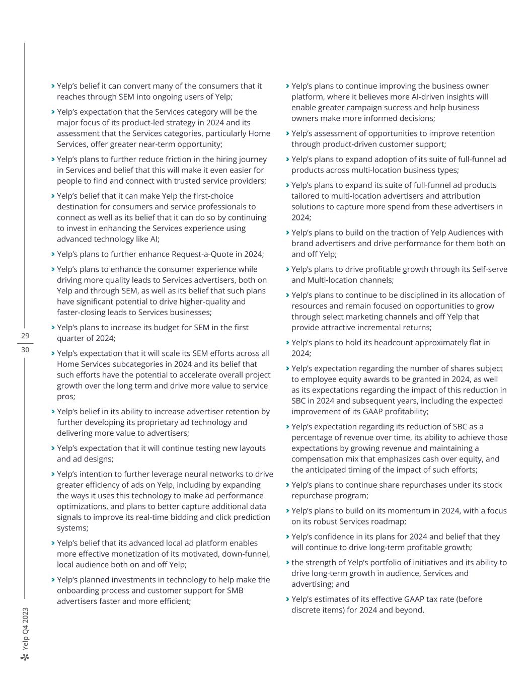 Ye lp Q 4 20 23 > Yelp’s belief it can convert many of the consumers that it reaches through SEM into ongoing users of Yelp; > Yelp’s expectation that the Services category will be the major focus of its product-led strategy in 2024 and its assessment that the Services categories, particularly Home Services, offer greater near-term opportunity; > Yelp’s plans to further reduce friction in the hiring journey in Services and belief that this will make it even easier for people to find and connect with trusted service providers; > Yelp’s belief that it can make Yelp the first-choice destination for consumers and service professionals to connect as well as its belief that it can do so by continuing to invest in enhancing the Services experience using advanced technology like AI; > Yelp’s plans to further enhance Request-a-Quote in 2024; > Yelp’s plans to enhance the consumer experience while driving more quality leads to Services advertisers, both on Yelp and through SEM, as well as its belief that such plans have significant potential to drive higher-quality and faster-closing leads to Services businesses; > Yelp’s plans to increase its budget for SEM in the first quarter of 2024; > Yelp’s expectation that it will scale its SEM efforts across all Home Services subcategories in 2024 and its belief that such efforts have the potential to accelerate overall project growth over the long term and drive more value to service pros; > Yelp’s belief in its ability to increase advertiser retention by further developing its proprietary ad technology and delivering more value to advertisers; > Yelp’s expectation that it will continue testing new layouts and ad designs; > Yelp’s intention to further leverage neural networks to drive greater efficiency of ads on Yelp, including by expanding the ways it uses this technology to make ad performance optimizations, and plans to better capture additional data signals to improve its real-time bidding and click prediction systems; > Yelp’s belief that its advanced local ad platform enables more effective monetization of its motivated, down-funnel, local audience both on and off Yelp; > Yelp’s planned investments in technology to help make the onboarding process and customer support for SMB advertisers faster and more efficient; > Yelp’s plans to continue improving the business owner platform, where it believes more AI-driven insights will enable greater campaign success and help business owners make more informed decisions; > Yelp’s assessment of opportunities to improve retention through product-driven customer support; > Yelp’s plans to expand adoption of its suite of full-funnel ad products across multi-location business types; > Yelp’s plans to expand its suite of full-funnel ad products tailored to multi-location advertisers and attribution solutions to capture more spend from these advertisers in 2024; > Yelp’s plans to build on the traction of Yelp Audiences with brand advertisers and drive performance for them both on and off Yelp; > Yelp’s plans to drive profitable growth through its Self-serve and Multi-location channels; > Yelp’s plans to continue to be disciplined in its allocation of resources and remain focused on opportunities to grow through select marketing channels and off Yelp that provide attractive incremental returns; > Yelp’s plans to hold its headcount approximately flat in 2024; > Yelp’s expectation regarding the number of shares subject to employee equity awards to be granted in 2024, as well as its expectations regarding the impact of this reduction in SBC in 2024 and subsequent years, including the expected improvement of its GAAP profitability; > Yelp’s expectation regarding its reduction of SBC as a percentage of revenue over time, its ability to achieve those expectations by growing revenue and maintaining a compensation mix that emphasizes cash over equity, and the anticipated timing of the impact of such efforts; > Yelp’s plans to continue share repurchases under its stock repurchase program; > Yelp’s plans to build on its momentum in 2024, with a focus on its robust Services roadmap; > Yelp’s confidence in its plans for 2024 and belief that they will continue to drive long-term profitable growth; > the strength of Yelp’s portfolio of initiatives and its ability to drive long-term growth in audience, Services and advertising; and > Yelp’s estimates of its effective GAAP tax rate (before discrete items) for 2024 and beyond. 29 30