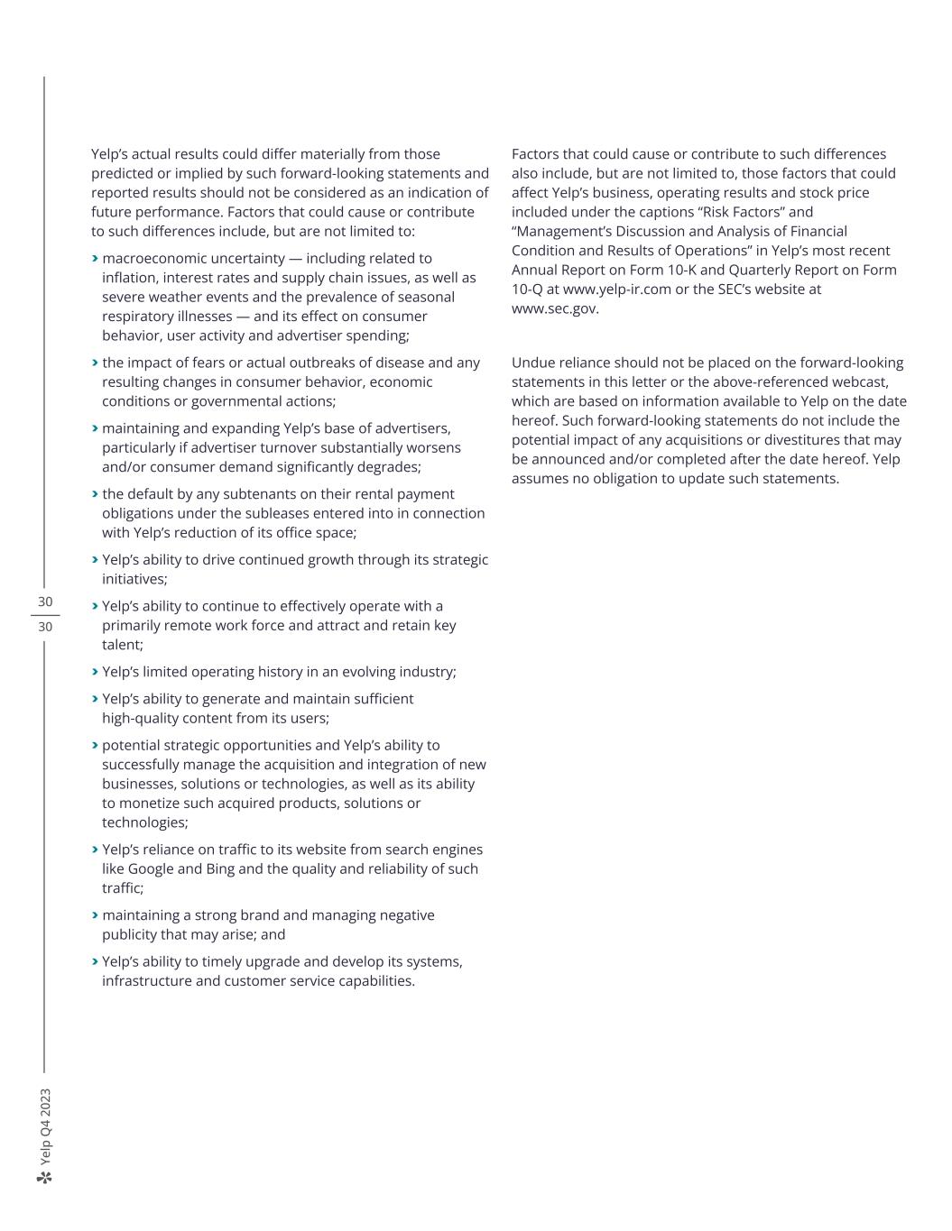 Ye lp Q 4 20 23 Yelp’s actual results could differ materially from those predicted or implied by such forward-looking statements and reported results should not be considered as an indication of future performance. Factors that could cause or contribute to such differences include, but are not limited to: > macroeconomic uncertainty — including related to inflation, interest rates and supply chain issues, as well as severe weather events and the prevalence of seasonal respiratory illnesses — and its effect on consumer behavior, user activity and advertiser spending; > the impact of fears or actual outbreaks of disease and any resulting changes in consumer behavior, economic conditions or governmental actions; > maintaining and expanding Yelp’s base of advertisers, particularly if advertiser turnover substantially worsens and/or consumer demand significantly degrades; > the default by any subtenants on their rental payment obligations under the subleases entered into in connection with Yelp’s reduction of its office space; > Yelp’s ability to drive continued growth through its strategic initiatives; > Yelp’s ability to continue to effectively operate with a primarily remote work force and attract and retain key talent; > Yelp’s limited operating history in an evolving industry; > Yelp’s ability to generate and maintain sufficient high-quality content from its users; > potential strategic opportunities and Yelp’s ability to successfully manage the acquisition and integration of new businesses, solutions or technologies, as well as its ability to monetize such acquired products, solutions or technologies; > Yelp’s reliance on traffic to its website from search engines like Google and Bing and the quality and reliability of such traffic; > maintaining a strong brand and managing negative publicity that may arise; and > Yelp’s ability to timely upgrade and develop its systems, infrastructure and customer service capabilities. Factors that could cause or contribute to such differences also include, but are not limited to, those factors that could affect Yelp’s business, operating results and stock price included under the captions “Risk Factors” and “Management’s Discussion and Analysis of Financial Condition and Results of Operations” in Yelp’s most recent Annual Report on Form 10-K and Quarterly Report on Form 10-Q at www.yelp-ir.com or the SEC’s website at www.sec.gov. Undue reliance should not be placed on the forward-looking statements in this letter or the above-referenced webcast, which are based on information available to Yelp on the date hereof. Such forward-looking statements do not include the potential impact of any acquisitions or divestitures that may be announced and/or completed after the date hereof. Yelp assumes no obligation to update such statements. 30 30