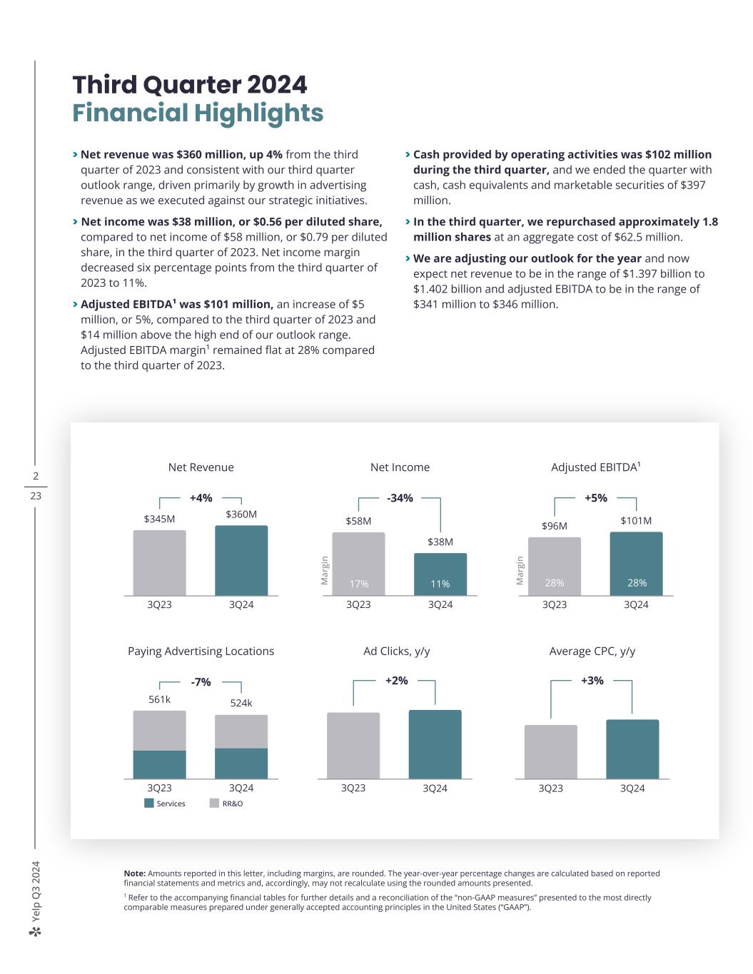 Ye lp Q 3 20 24 2 23 Note: Amounts reported in this letter, including margins, are rounded. The year-over-year percentage changes are calculated based on reported financial statements and metrics and, accordingly, may not recalculate using the rounded amounts presented. 1 Refer to the accompanying financial tables for further details and a reconciliation of the “non-GAAP measures” presented to the most directly comparable measures prepared under generally accepted accounting principles in the United States (“GAAP”). Third Quarter 2024 Financial Highlights > Net revenue was $360 million, up 4% from the third quarter of 2023 and consistent with our third quarter outlook range, driven primarily by growth in advertising revenue as we executed against our strategic initiatives. > Net income was $38 million, or $0.56 per diluted share, compared to net income of $58 million, or $0.79 per diluted share, in the third quarter of 2023. Net income margin decreased six percentage points from the third quarter of 2023 to 11%. > Adjusted EBITDA¹ was $101 million, an increase of $5 million, or 5%, compared to the third quarter of 2023 and $14 million above the high end of our outlook range. Adjusted EBITDA margin¹ remained flat at 28% compared to the third quarter of 2023. > Cash provided by operating activities was $102 million during the third quarter, and we ended the quarter with cash, cash equivalents and marketable securities of $397 million. > In the third quarter, we repurchased approximately 1.8 million shares at an aggregate cost of $62.5 million. > We are adjusting our outlook for the year and now expect net revenue to be in the range of $1.397 billion to $1.402 billion and adjusted EBITDA to be in the range of $341 million to $346 million. 19% 17% Net Revenue +4% $345M $360M 3Q23 3Q24 Ad Clicks, y/y +2% 3Q23 3Q24 Average CPC, y/y +3% 3Q23 3Q24 Paying Advertising Locations -7% 561k 524k 3Q23 3Q24 Services RR&O Adjusted EBITDA¹ +5% $96M $101M 3Q23 3Q24 M ar gi n 28% 28%8% 7%M ar gi n 8% 7% Net Income -34% $58M $38M 3Q23 3Q24 1117%