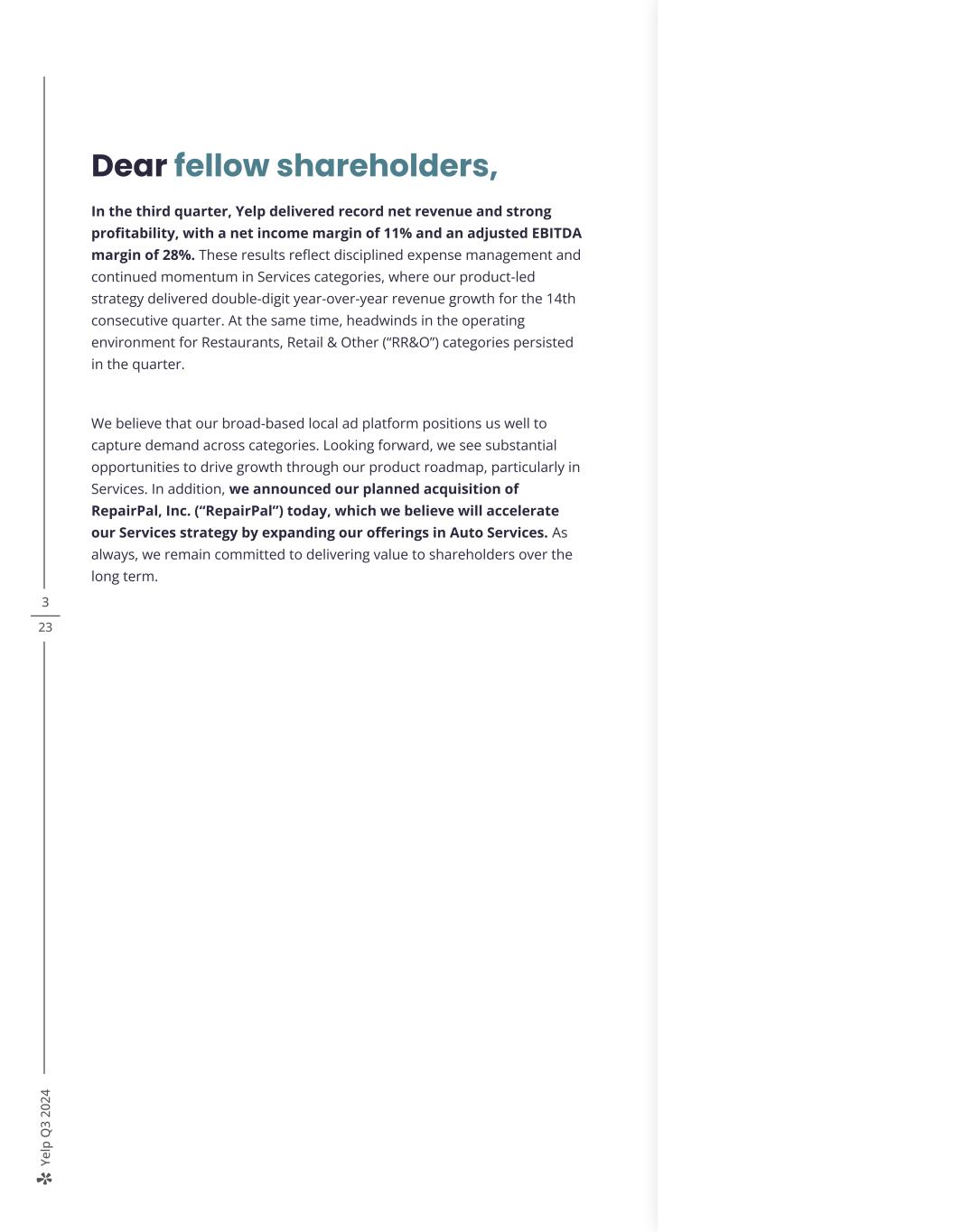 Ye lp Q 3 20 24 3 23 Dear fellow shareholders, In the third quarter, Yelp delivered record net revenue and strong profitability, with a net income margin of 11% and an adjusted EBITDA margin of 28%. These results reflect disciplined expense management and continued momentum in Services categories, where our product-led strategy delivered double-digit year-over-year revenue growth for the 14th consecutive quarter. At the same time, headwinds in the operating environment for Restaurants, Retail & Other (“RR&O”) categories persisted in the quarter. We believe that our broad-based local ad platform positions us well to capture demand across categories. Looking forward, we see substantial opportunities to drive growth through our product roadmap, particularly in Services. In addition, we announced our planned acquisition of RepairPal, Inc. (“RepairPal”) today, which we believe will accelerate our Services strategy by expanding our offerings in Auto Services. As always, we remain committed to delivering value to shareholders over the long term.