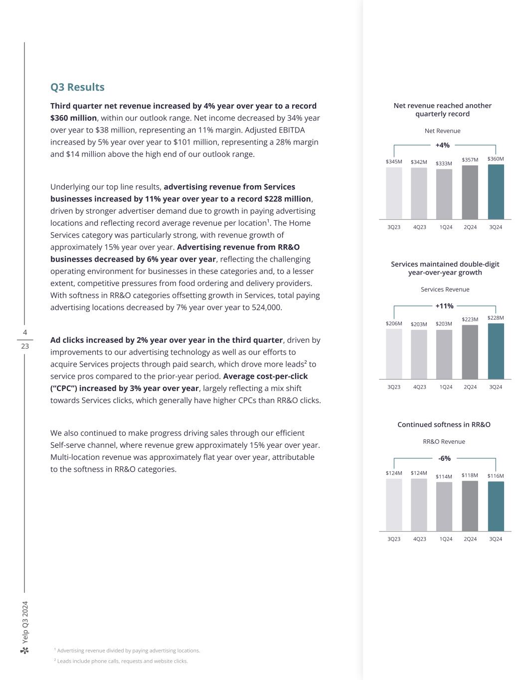 Ye lp Q 3 20 24 4 23 Q3 Results Third quarter net revenue increased by 4% year over year to a record $360 million, within our outlook range. Net income decreased by 34% year over year to $38 million, representing an 11% margin. Adjusted EBITDA increased by 5% year over year to $101 million, representing a 28% margin and $14 million above the high end of our outlook range. Underlying our top line results, advertising revenue from Services businesses increased by 11% year over year to a record $228 million, driven by stronger advertiser demand due to growth in paying advertising locations and reflecting record average revenue per location¹. The Home Services category was particularly strong, with revenue growth of approximately 15% year over year. Advertising revenue from RR&O businesses decreased by 6% year over year, reflecting the challenging operating environment for businesses in these categories and, to a lesser extent, competitive pressures from food ordering and delivery providers. With softness in RR&O categories offsetting growth in Services, total paying advertising locations decreased by 7% year over year to 524,000. Ad clicks increased by 2% year over year in the third quarter, driven by improvements to our advertising technology as well as our efforts to acquire Services projects through paid search, which drove more leads² to service pros compared to the prior-year period. Average cost-per-click (“CPC”) increased by 3% year over year, largely reflecting a mix shift towards Services clicks, which generally have higher CPCs than RR&O clicks. We also continued to make progress driving sales through our efficient Self-serve channel, where revenue grew approximately 15% year over year. Multi-location revenue was approximately flat year over year, attributable to the softness in RR&O categories. Net revenue reached another quarterly record Net Revenue +4% $345M 3Q23 4Q23 1Q24 2Q24 3Q24 $360M$342M $333M $357M Services maintained double-digit year-over-year growth Services Revenue +11% $206M 3Q23 4Q23 1Q24 2Q24 3Q24 $228M $203M $203M $223M Continued softness in RR&O RR&O Revenue -6% $124M 3Q23 4Q23 1Q24 2Q24 3Q24 $116M$124M $114M $118M ¹ Advertising revenue divided by paying advertising locations. ² Leads include phone calls, requests and website clicks.