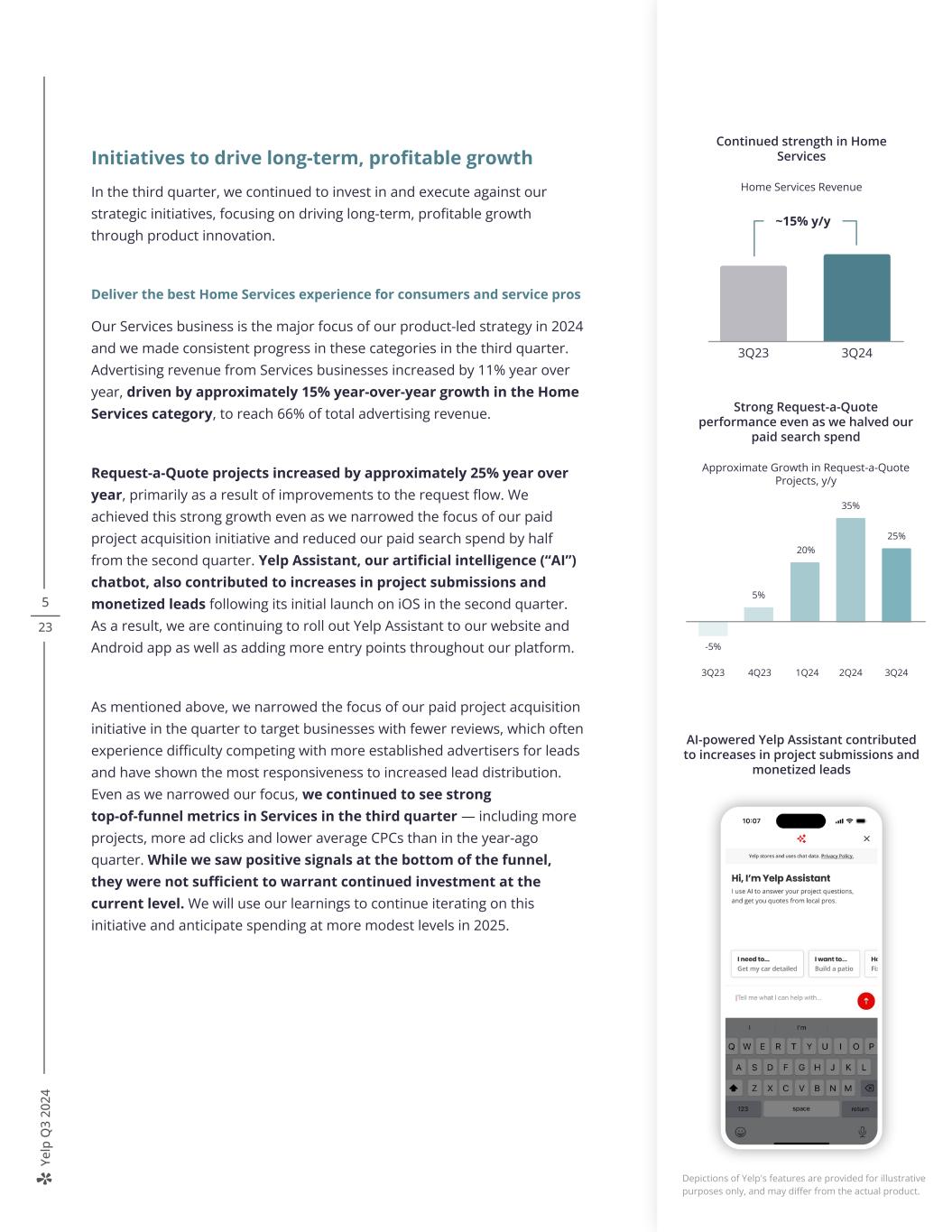 Ye lp Q 3 20 24 5 23 Initiatives to drive long-term, profitable growth In the third quarter, we continued to invest in and execute against our strategic initiatives, focusing on driving long-term, profitable growth through product innovation. Deliver the best Home Services experience for consumers and service pros Our Services business is the major focus of our product-led strategy in 2024 and we made consistent progress in these categories in the third quarter. Advertising revenue from Services businesses increased by 11% year over year, driven by approximately 15% year-over-year growth in the Home Services category, to reach 66% of total advertising revenue. Request-a-Quote projects increased by approximately 25% year over year, primarily as a result of improvements to the request flow. We achieved this strong growth even as we narrowed the focus of our paid project acquisition initiative and reduced our paid search spend by half from the second quarter. Yelp Assistant, our artificial intelligence (“AI”) chatbot, also contributed to increases in project submissions and monetized leads following its initial launch on iOS in the second quarter. As a result, we are continuing to roll out Yelp Assistant to our website and Android app as well as adding more entry points throughout our platform. As mentioned above, we narrowed the focus of our paid project acquisition initiative in the quarter to target businesses with fewer reviews, which often experience difficulty competing with more established advertisers for leads and have shown the most responsiveness to increased lead distribution. Even as we narrowed our focus, we continued to see strong top-of-funnel metrics in Services in the third quarter — including more projects, more ad clicks and lower average CPCs than in the year-ago quarter. While we saw positive signals at the bottom of the funnel, they were not sufficient to warrant continued investment at the current level. We will use our learnings to continue iterating on this initiative and anticipate spending at more modest levels in 2025. Strong Request-a-Quote performance even as we halved our paid search spend Approximate Growth in Request-a-Quote Projects, y/y 3Q23 4Q23 1Q24 3Q242Q24 -5% 5% 20% 35% 25% ~15% y/y 3Q23 3Q24 Continued strength in Home Services Home Services Revenue AI-powered Yelp Assistant contributed to increases in project submissions and monetized leads Depictions of Yelp's features are provided for illustrative purposes only, and may differ from the actual product.
