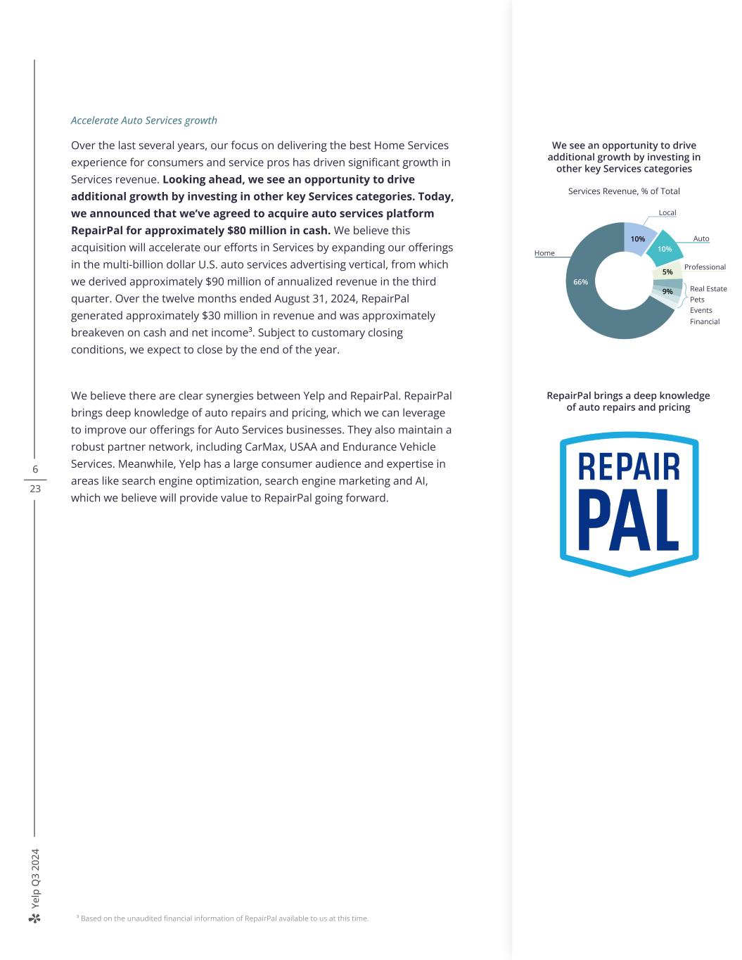 Ye lp Q 3 20 24 6 23 Accelerate Auto Services growth Over the last several years, our focus on delivering the best Home Services experience for consumers and service pros has driven significant growth in Services revenue. Looking ahead, we see an opportunity to drive additional growth by investing in other key Services categories. Today, we announced that we’ve agreed to acquire auto services platform RepairPal for approximately $80 million in cash. We believe this acquisition will accelerate our efforts in Services by expanding our offerings in the multi-billion dollar U.S. auto services advertising vertical, from which we derived approximately $90 million of annualized revenue in the third quarter. Over the twelve months ended August 31, 2024, RepairPal generated approximately $30 million in revenue and was approximately breakeven on cash and net income³. Subject to customary closing conditions, we expect to close by the end of the year. We believe there are clear synergies between Yelp and RepairPal. RepairPal brings deep knowledge of auto repairs and pricing, which we can leverage to improve our offerings for Auto Services businesses. They also maintain a robust partner network, including CarMax, USAA and Endurance Vehicle Services. Meanwhile, Yelp has a large consumer audience and expertise in areas like search engine optimization, search engine marketing and AI, which we believe will provide value to RepairPal going forward. 2Q23 2Q24 Net Income Margin 11%4% Adjusted EBITDA Margin 26%25% +6% We delivered record net revenue while expanding margins Net Revenue Home Local 67% 10% Auto 10% Professional 5% Real EstateFin an cia l Ev en t Pe ts RepairPal brings a deep knowledge of auto repairs and pricing 10% Auto Real Estate Pets Events Financial We see an opportunity to drive additional growth by investing in other key Services categories Services Revenue, % of Total ³ Based on the unaudited financial information of RepairPal available to us at this time. 10% 66% Home Local 5% Professional 9%