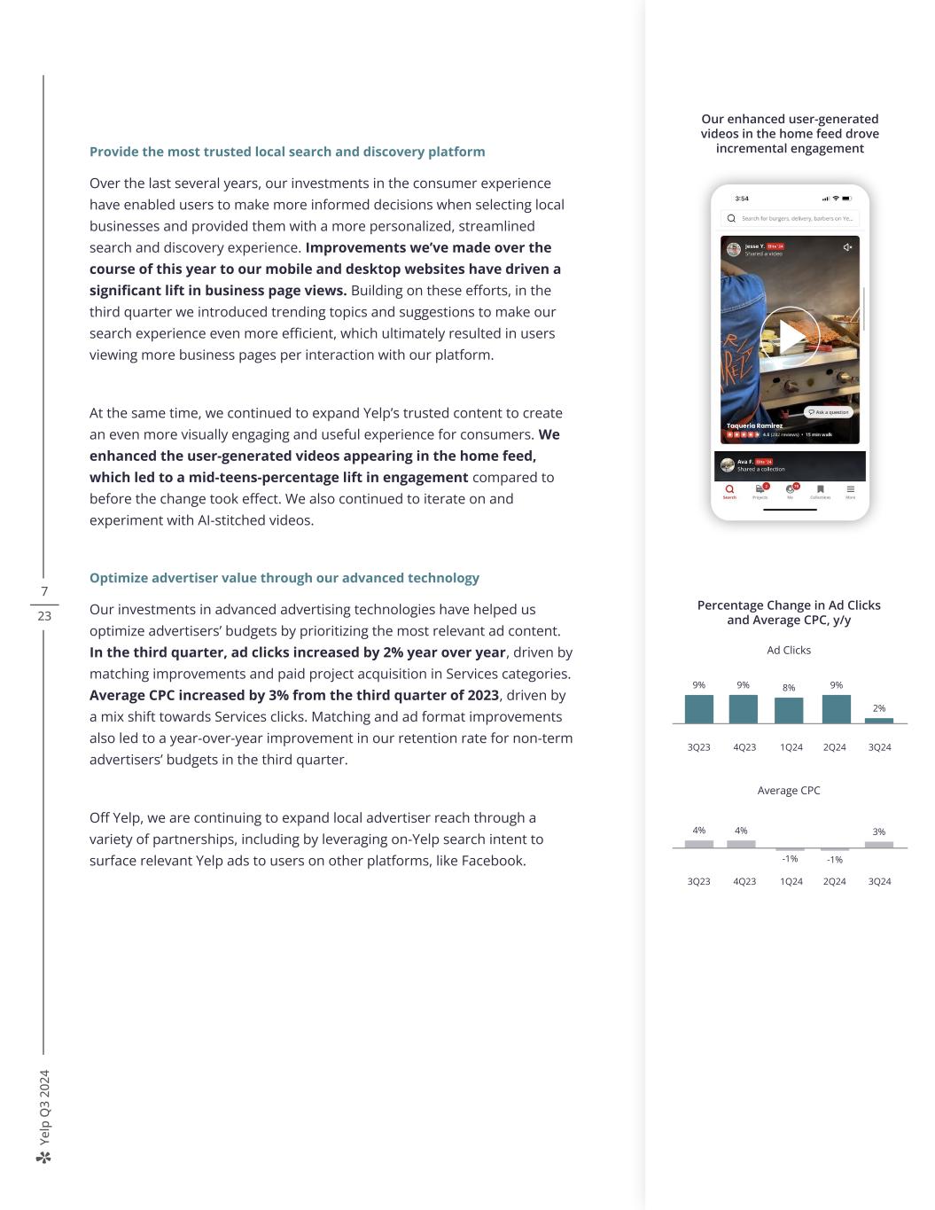 Ye lp Q 3 20 24 7 23 Provide the most trusted local search and discovery platform Over the last several years, our investments in the consumer experience have enabled users to make more informed decisions when selecting local businesses and provided them with a more personalized, streamlined search and discovery experience. Improvements we’ve made over the course of this year to our mobile and desktop websites have driven a significant lift in business page views. Building on these efforts, in the third quarter we introduced trending topics and suggestions to make our search experience even more efficient, which ultimately resulted in users viewing more business pages per interaction with our platform. At the same time, we continued to expand Yelp’s trusted content to create an even more visually engaging and useful experience for consumers. We enhanced the user-generated videos appearing in the home feed, which led to a mid-teens-percentage lift in engagement compared to before the change took effect. We also continued to iterate on and experiment with AI-stitched videos. Optimize advertiser value through our advanced technology Our investments in advanced advertising technologies have helped us optimize advertisers’ budgets by prioritizing the most relevant ad content. In the third quarter, ad clicks increased by 2% year over year, driven by matching improvements and paid project acquisition in Services categories. Average CPC increased by 3% from the third quarter of 2023, driven by a mix shift towards Services clicks. Matching and ad format improvements also led to a year-over-year improvement in our retention rate for non-term advertisers’ budgets in the third quarter. Off Yelp, we are continuing to expand local advertiser reach through a variety of partnerships, including by leveraging on-Yelp search intent to surface relevant Yelp ads to users on other platforms, like Facebook. Home 67% Fin an cia l 2Q23 2Q24 Net Income Margin 11%4% Adjusted EBITDA Margin 26%25% +6% We delivered record net revenue while expanding margins Net Revenue Home Local 67% 10% Auto 10% Professional 5% Real EstateFin an cia l Ev en t Pe ts Our enhanced user-generated videos in the home feed drove incremental engagement Percentage Change in Ad Clicks and Average CPC, y/y Ad Clicks 9% 3Q23 4Q23 1Q24 2Q24 3Q24 2% 9% 8% 9% Average CPC 4% 3Q23 4Q23 1Q24 2Q24 3Q24 -1% 4% 3% -1%
