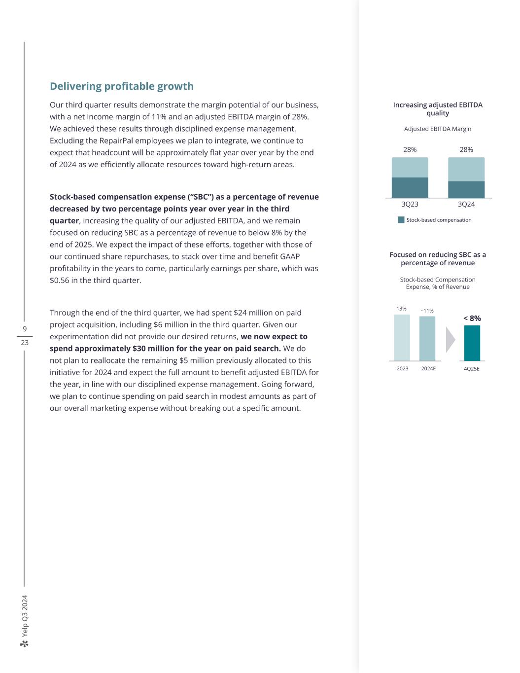 Ye lp Q 3 20 24 9 23 Delivering profitable growth Our third quarter results demonstrate the margin potential of our business, with a net income margin of 11% and an adjusted EBITDA margin of 28%. We achieved these results through disciplined expense management. Excluding the RepairPal employees we plan to integrate, we continue to expect that headcount will be approximately flat year over year by the end of 2024 as we efficiently allocate resources toward high-return areas. Stock-based compensation expense (“SBC”) as a percentage of revenue decreased by two percentage points year over year in the third quarter, increasing the quality of our adjusted EBITDA, and we remain focused on reducing SBC as a percentage of revenue to below 8% by the end of 2025. We expect the impact of these efforts, together with those of our continued share repurchases, to stack over time and benefit GAAP profitability in the years to come, particularly earnings per share, which was $0.56 in the third quarter. Through the end of the third quarter, we had spent $24 million on paid project acquisition, including $6 million in the third quarter. Given our experimentation did not provide our desired returns, we now expect to spend approximately $30 million for the year on paid search. We do not plan to reallocate the remaining $5 million previously allocated to this initiative for 2024 and expect the full amount to benefit adjusted EBITDA for the year, in line with our disciplined expense management. Going forward, we plan to continue spending on paid search in modest amounts as part of our overall marketing expense without breaking out a specific amount. 8% 3Q23 3Q24 Stock-based compensation 28% 28% Increasing adjusted EBITDA quality Adjusted EBITDA Margin Focused on reducing SBC as a percentage of revenue Stock-based Compensation Expense, % of Revenue 13% ~11% < 8% 2023 2024E 4Q25E