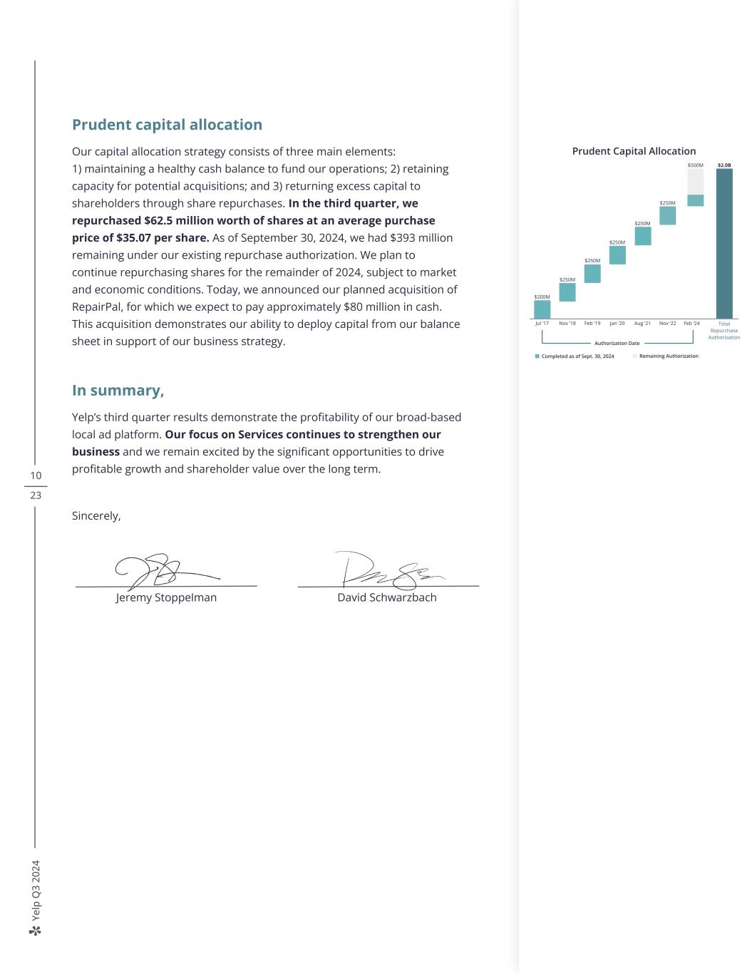 Ye lp Q 3 20 24 10 23 Prudent capital allocation Our capital allocation strategy consists of three main elements: 1) maintaining a healthy cash balance to fund our operations; 2) retaining capacity for potential acquisitions; and 3) returning excess capital to shareholders through share repurchases. In the third quarter, we repurchased $62.5 million worth of shares at an average purchase price of $35.07 per share. As of September 30, 2024, we had $393 million remaining under our existing repurchase authorization. We plan to continue repurchasing shares for the remainder of 2024, subject to market and economic conditions. Today, we announced our planned acquisition of RepairPal, for which we expect to pay approximately $80 million in cash. This acquisition demonstrates our ability to deploy capital from our balance sheet in support of our business strategy. In summary, Yelp’s third quarter results demonstrate the profitability of our broad-based local ad platform. Our focus on Services continues to strengthen our business and we remain excited by the significant opportunities to drive profitable growth and shareholder value over the long term. Sincerely, Total Repurchase Authorization Authorization Date Prudent Capital Allocation $2.0B Completed as of Sept. 30, 2024 Remaining Authorization $200M $250M $250M $250M $250M $250M Nov ‘22Jul ‘17 Nov ‘18 Feb ‘19 Jan ‘20 Aug ‘21 Feb ‘24 $500M Jeremy Stoppelman David Schwarzbach