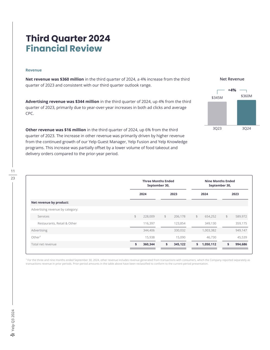 Ye lp Q 3 20 24 11 23 Revenue Net revenue was $360 million in the third quarter of 2024, a 4% increase from the third quarter of 2023 and consistent with our third quarter outlook range. Advertising revenue was $344 million in the third quarter of 2024, up 4% from the third quarter of 2023, primarily due to year-over-year increases in both ad clicks and average CPC. Other revenue was $16 million in the third quarter of 2024, up 6% from the third quarter of 2023. The increase in other revenue was primarily driven by higher revenue from the continued growth of our Yelp Guest Manager, Yelp Fusion and Yelp Knowledge programs. This increase was partially offset by a lower volume of food takeout and delivery orders compared to the prior-year period. Third Quarter 2024 Financial Review Three Months Ended September 30, Nine Months Ended September 30, 2024 2023 2024 2023 Net revenue by product: Advertising revenue by category: Services $ 228,009 $ 206,178 $ 654,252 $ 589,972 Restaurants, Retail & Other 116,397 123,854 349,130 359,175 Advertising 344,406 330,032 1,003,382 949,147 Other¹ 15,938 15,090 46,730 45,539 Total net revenue $ 360,344 $ 345,122 $ 1,050,112 $ 994,686 ¹ For the three and nine months ended September 30, 2024, other revenue includes revenue generated from transactions with consumers, which the Company reported separately as transactions revenue in prior periods. Prior-period amounts in the table above have been reclassified to conform to the current-period presentation. Net Revenue +4% $345M $360M 3Q23 3Q24