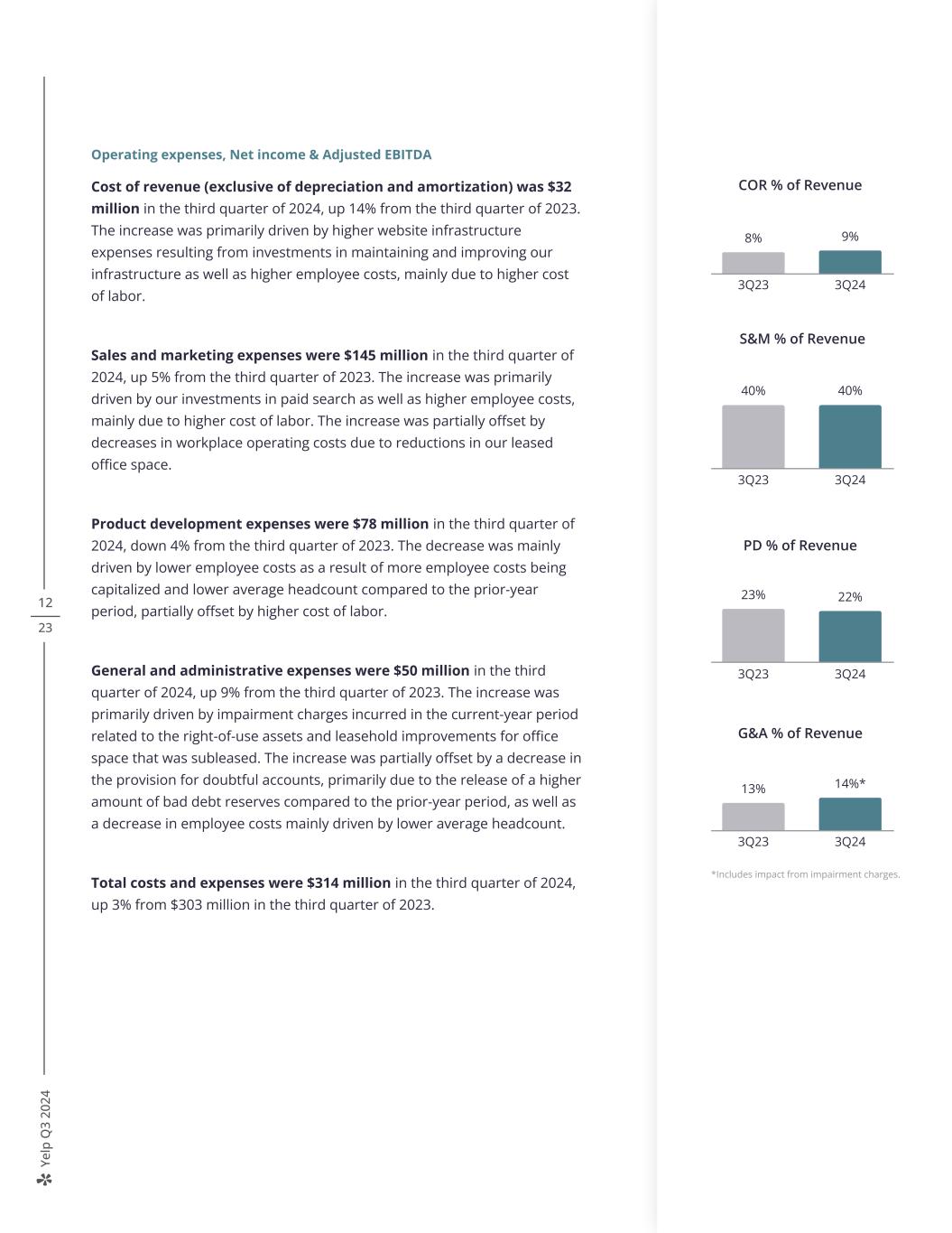 Ye lp Q 3 20 24 12 23 Operating expenses, Net income & Adjusted EBITDA Cost of revenue (exclusive of depreciation and amortization) was $32 million in the third quarter of 2024, up 14% from the third quarter of 2023. The increase was primarily driven by higher website infrastructure expenses resulting from investments in maintaining and improving our infrastructure as well as higher employee costs, mainly due to higher cost of labor. Sales and marketing expenses were $145 million in the third quarter of 2024, up 5% from the third quarter of 2023. The increase was primarily driven by our investments in paid search as well as higher employee costs, mainly due to higher cost of labor. The increase was partially offset by decreases in workplace operating costs due to reductions in our leased office space. Product development expenses were $78 million in the third quarter of 2024, down 4% from the third quarter of 2023. The decrease was mainly driven by lower employee costs as a result of more employee costs being capitalized and lower average headcount compared to the prior-year period, partially offset by higher cost of labor. General and administrative expenses were $50 million in the third quarter of 2024, up 9% from the third quarter of 2023. The increase was primarily driven by impairment charges incurred in the current-year period related to the right-of-use assets and leasehold improvements for office space that was subleased. The increase was partially offset by a decrease in the provision for doubtful accounts, primarily due to the release of a higher amount of bad debt reserves compared to the prior-year period, as well as a decrease in employee costs mainly driven by lower average headcount. Total costs and expenses were $314 million in the third quarter of 2024, up 3% from $303 million in the third quarter of 2023. COR % of Revenue 8% 9% 3Q23 3Q24 S&M % of Revenue 40% 40% 3Q23 3Q24 PD % of Revenue 23% 22% 3Q23 3Q24 G&A % of Revenue 13% 14%* 3Q23 3Q24 *Includes impact from impairment charges.