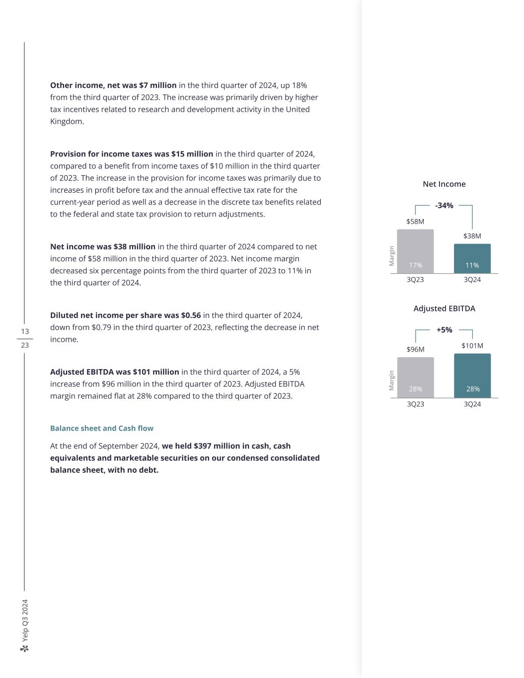 Ye lp Q 3 20 24 13 23 Other income, net was $7 million in the third quarter of 2024, up 18% from the third quarter of 2023. The increase was primarily driven by higher tax incentives related to research and development activity in the United Kingdom. Provision for income taxes was $15 million in the third quarter of 2024, compared to a benefit from income taxes of $10 million in the third quarter of 2023. The increase in the provision for income taxes was primarily due to increases in profit before tax and the annual effective tax rate for the current-year period as well as a decrease in the discrete tax benefits related to the federal and state tax provision to return adjustments. Net income was $38 million in the third quarter of 2024 compared to net income of $58 million in the third quarter of 2023. Net income margin decreased six percentage points from the third quarter of 2023 to 11% in the third quarter of 2024. Diluted net income per share was $0.56 in the third quarter of 2024, down from $0.79 in the third quarter of 2023, reflecting the decrease in net income. Adjusted EBITDA was $101 million in the third quarter of 2024, a 5% increase from $96 million in the third quarter of 2023. Adjusted EBITDA margin remained flat at 28% compared to the third quarter of 2023. Balance sheet and Cash flow At the end of September 2024, we held $397 million in cash, cash equivalents and marketable securities on our condensed consolidated balance sheet, with no debt. 19% 17% M ar gi n 8% 7% Net Income -34% $58M $38M 3Q23 3Q24 1117% Adjusted EBITDA +5% $96M $101M 3Q23 3Q24 M ar gi n 28% 28%