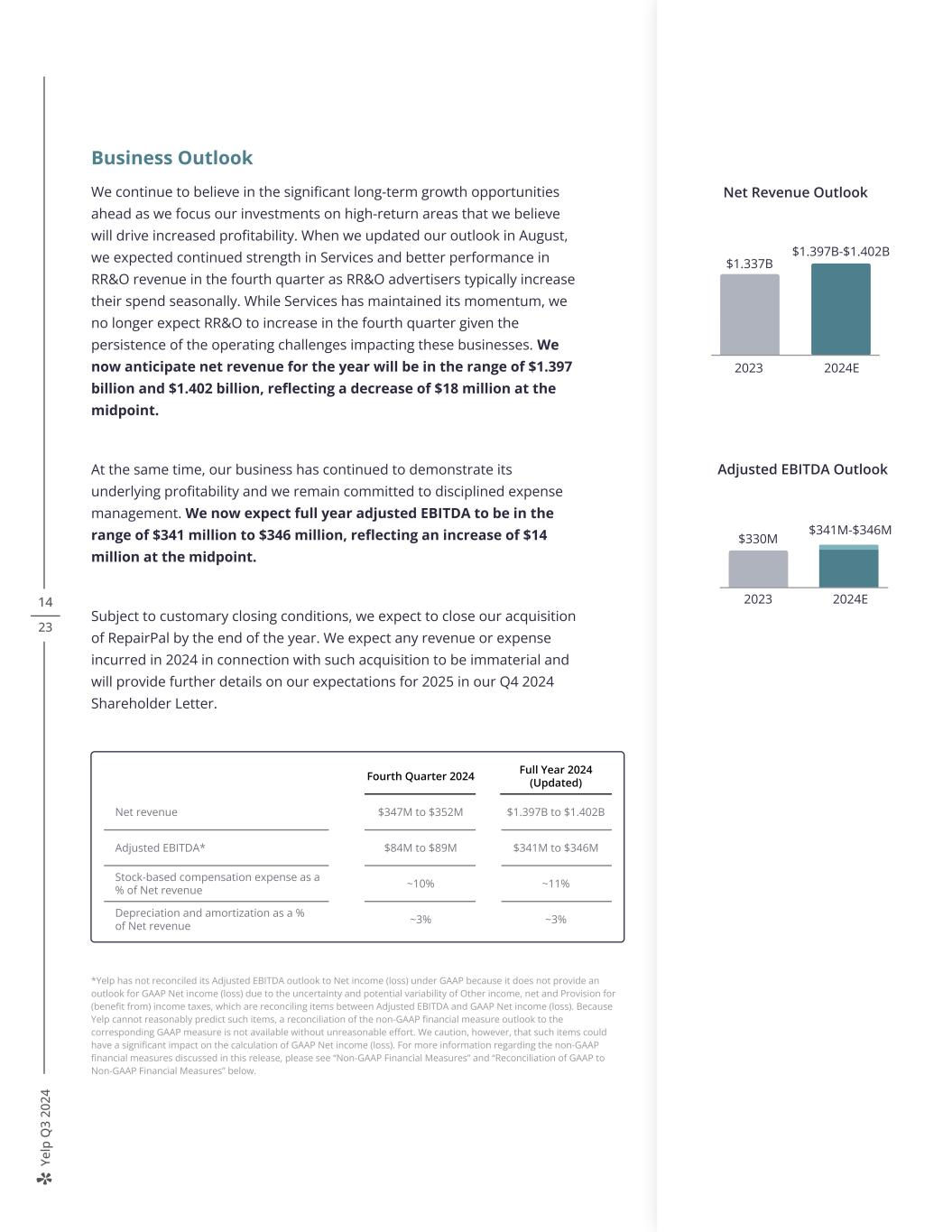 Ye lp Q 3 20 24 14 23 Business Outlook We continue to believe in the significant long-term growth opportunities ahead as we focus our investments on high-return areas that we believe will drive increased profitability. When we updated our outlook in August, we expected continued strength in Services and better performance in RR&O revenue in the fourth quarter as RR&O advertisers typically increase their spend seasonally. While Services has maintained its momentum, we no longer expect RR&O to increase in the fourth quarter given the persistence of the operating challenges impacting these businesses. We now anticipate net revenue for the year will be in the range of $1.397 billion and $1.402 billion, reflecting a decrease of $18 million at the midpoint. At the same time, our business has continued to demonstrate its underlying profitability and we remain committed to disciplined expense management. We now expect full year adjusted EBITDA to be in the range of $341 million to $346 million, reflecting an increase of $14 million at the midpoint. Subject to customary closing conditions, we expect to close our acquisition of RepairPal by the end of the year. We expect any revenue or expense incurred in 2024 in connection with such acquisition to be immaterial and will provide further details on our expectations for 2025 in our Q4 2024 Shareholder Letter. *Yelp has not reconciled its Adjusted EBITDA outlook to Net income (loss) under GAAP because it does not provide an outlook for GAAP Net income (loss) due to the uncertainty and potential variability of Other income, net and Provision for (benefit from) income taxes, which are reconciling items between Adjusted EBITDA and GAAP Net income (loss). Because Yelp cannot reasonably predict such items, a reconciliation of the non-GAAP financial measure outlook to the corresponding GAAP measure is not available without unreasonable effort. We caution, however, that such items could have a significant impact on the calculation of GAAP Net income (loss). For more information regarding the non-GAAP financial measures discussed in this release, please see “Non-GAAP Financial Measures” and “Reconciliation of GAAP to Non-GAAP Financial Measures” below. $330M Adjusted EBITDA Outlook 2023 2024E $341M-$346M 2023 2024E $1.337B $1.397B-$1.402B Net Revenue Outlook Fourth Quarter 2024 Full Year 2024 (Updated) Net revenue $347M to $352M $1.397B to $1.402B Adjusted EBITDA* $84M to $89M $341M to $346M Stock-based compensation expense as a % of Net revenue ~10% ~11% Depreciation and amortization as a % of Net revenue ~3% ~3%