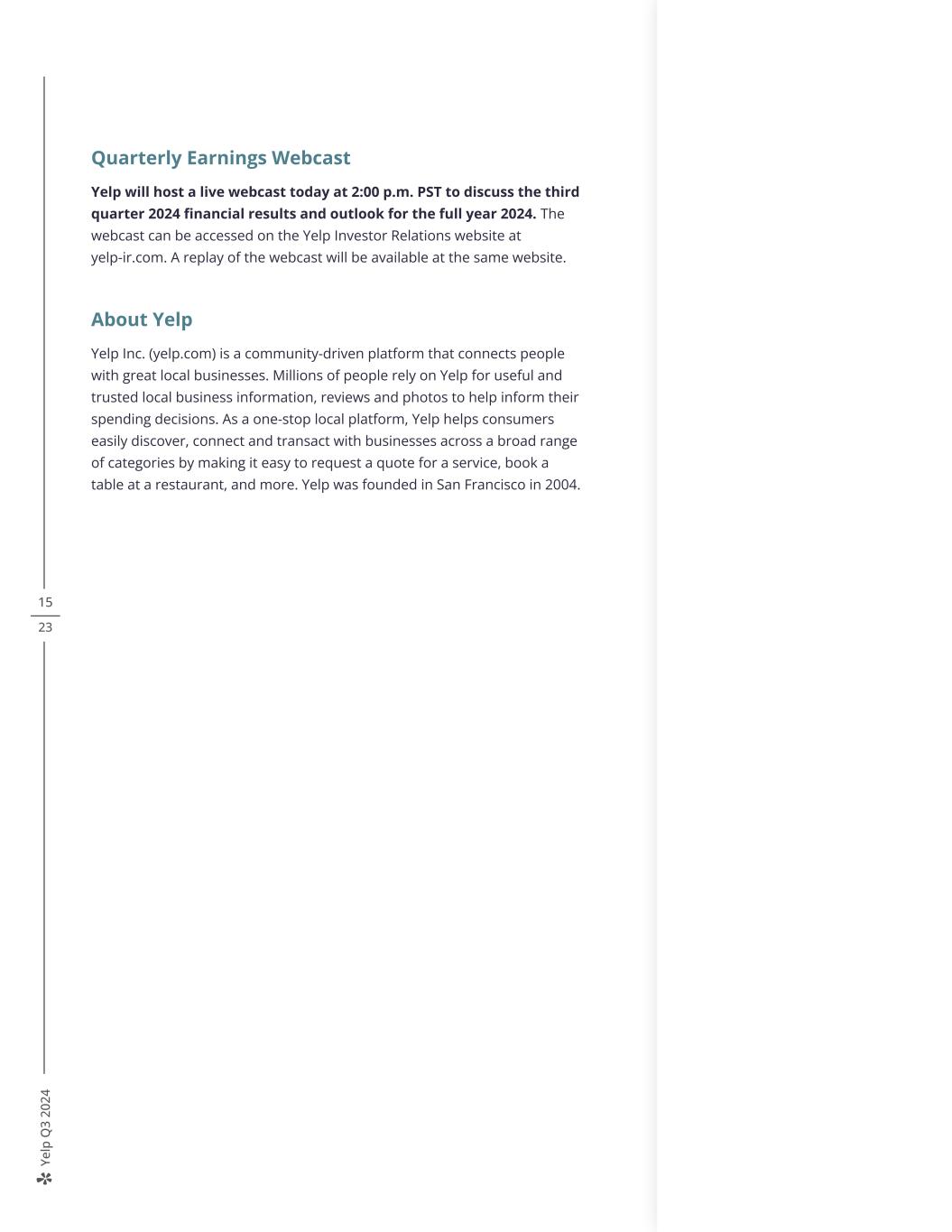 Ye lp Q 3 20 24 15 23 Quarterly Earnings Webcast Yelp will host a live webcast today at 2:00 p.m. PST to discuss the third quarter 2024 financial results and outlook for the full year 2024. The webcast can be accessed on the Yelp Investor Relations website at yelp-ir.com. A replay of the webcast will be available at the same website. About Yelp Yelp Inc. (yelp.com) is a community-driven platform that connects people with great local businesses. Millions of people rely on Yelp for useful and trusted local business information, reviews and photos to help inform their spending decisions. As a one-stop local platform, Yelp helps consumers easily discover, connect and transact with businesses across a broad range of categories by making it easy to request a quote for a service, book a table at a restaurant, and more. Yelp was founded in San Francisco in 2004.