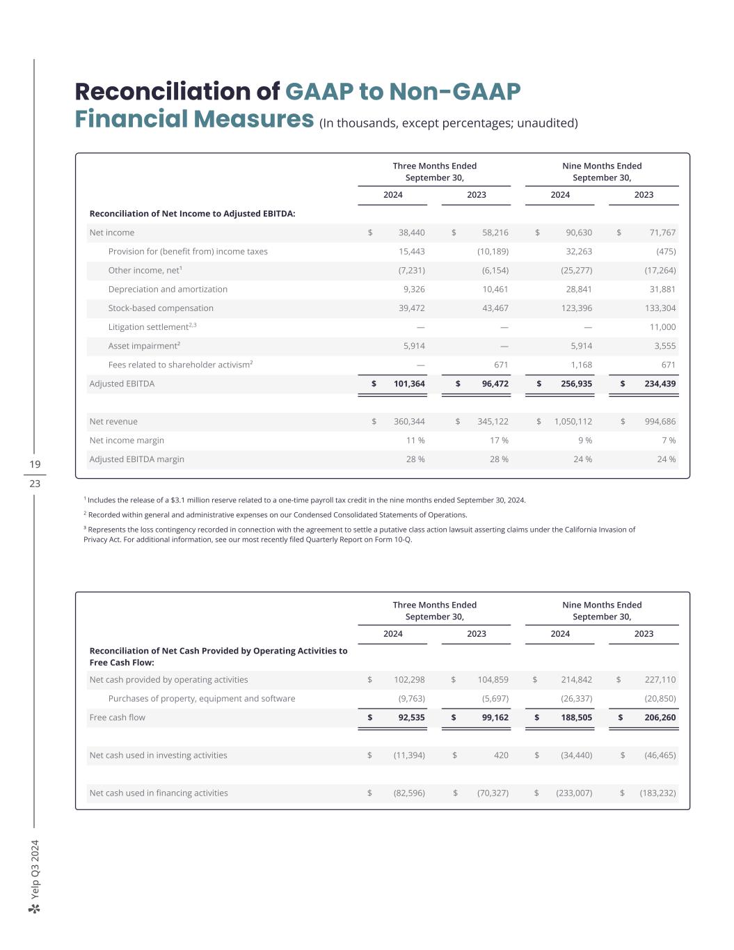 Ye lp Q 3 20 24 19 23 Reconciliation of GAAP to Non-GAAP Financial Measures (In thousands, except percentages; unaudited) 1 Includes the release of a $3.1 million reserve related to a one-time payroll tax credit in the nine months ended September 30, 2024. 2 Recorded within general and administrative expenses on our Condensed Consolidated Statements of Operations. ³ Represents the loss contingency recorded in connection with the agreement to settle a putative class action lawsuit asserting claims under the California Invasion of Privacy Act. For additional information, see our most recently filed Quarterly Report on Form 10-Q. Three Months Ended September 30, Nine Months Ended September 30, 2024 2023 2024 2023 Reconciliation of Net Income to Adjusted EBITDA: Net income $ 38,440 $ 58,216 $ 90,630 $ 71,767 Provision for (benefit from) income taxes 15,443 (10,189) 32,263 (475) Other income, net¹ (7,231) (6,154) (25,277) (17,264) Depreciation and amortization 9,326 10,461 28,841 31,881 Stock-based compensation 39,472 43,467 123,396 133,304 Litigation settlement2,3 — — — 11,000 Asset impairment² 5,914 — 5,914 3,555 Fees related to shareholder activism² — 671 1,168 671 Adjusted EBITDA $ 101,364 $ 96,472 $ 256,935 $ 234,439 Net revenue $ 360,344 $ 345,122 $ 1,050,112 $ 994,686 Net income margin 11 % 17 % 9 % 7 % Adjusted EBITDA margin 28 % 28 % 24 % 24 % Three Months Ended September 30, Nine Months Ended September 30, 2024 2023 2024 2023 Reconciliation of Net Cash Provided by Operating Activities to Free Cash Flow: Net cash provided by operating activities $ 102,298 $ 104,859 $ 214,842 $ 227,110 Purchases of property, equipment and software (9,763) (5,697) (26,337) (20,850) Free cash flow $ 92,535 $ 99,162 $ 188,505 $ 206,260 Net cash used in investing activities $ (11,394) $ 420 $ (34,440) $ (46,465) Net cash used in financing activities $ (82,596) $ (70,327) $ (233,007) $ (183,232)