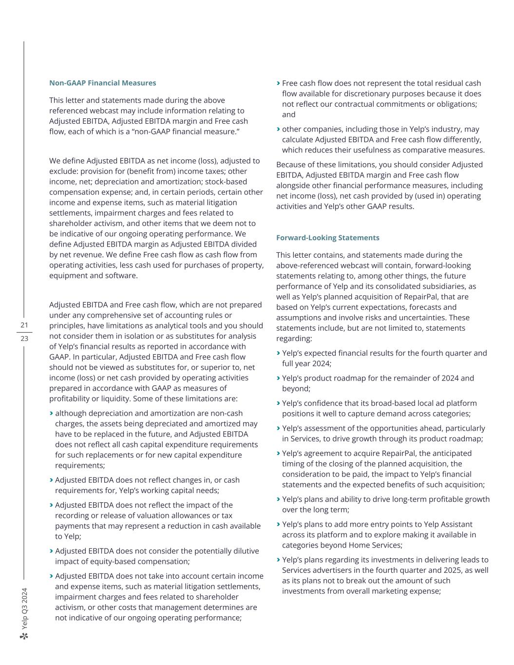 Ye lp Q 3 20 24 Non-GAAP Financial Measures This letter and statements made during the above referenced webcast may include information relating to Adjusted EBITDA, Adjusted EBITDA margin and Free cash flow, each of which is a “non-GAAP financial measure.” We define Adjusted EBITDA as net income (loss), adjusted to exclude: provision for (benefit from) income taxes; other income, net; depreciation and amortization; stock-based compensation expense; and, in certain periods, certain other income and expense items, such as material litigation settlements, impairment charges and fees related to shareholder activism, and other items that we deem not to be indicative of our ongoing operating performance. We define Adjusted EBITDA margin as Adjusted EBITDA divided by net revenue. We define Free cash flow as cash flow from operating activities, less cash used for purchases of property, equipment and software. Adjusted EBITDA and Free cash flow, which are not prepared under any comprehensive set of accounting rules or principles, have limitations as analytical tools and you should not consider them in isolation or as substitutes for analysis of Yelp’s financial results as reported in accordance with GAAP. In particular, Adjusted EBITDA and Free cash flow should not be viewed as substitutes for, or superior to, net income (loss) or net cash provided by operating activities prepared in accordance with GAAP as measures of profitability or liquidity. Some of these limitations are: > although depreciation and amortization are non-cash charges, the assets being depreciated and amortized may have to be replaced in the future, and Adjusted EBITDA does not reflect all cash capital expenditure requirements for such replacements or for new capital expenditure requirements; > Adjusted EBITDA does not reflect changes in, or cash requirements for, Yelp’s working capital needs; > Adjusted EBITDA does not reflect the impact of the recording or release of valuation allowances or tax payments that may represent a reduction in cash available to Yelp; > Adjusted EBITDA does not consider the potentially dilutive impact of equity-based compensation; > Adjusted EBITDA does not take into account certain income and expense items, such as material litigation settlements, impairment charges and fees related to shareholder activism, or other costs that management determines are not indicative of our ongoing operating performance; > Free cash flow does not represent the total residual cash flow available for discretionary purposes because it does not reflect our contractual commitments or obligations; and > other companies, including those in Yelp’s industry, may calculate Adjusted EBITDA and Free cash flow differently, which reduces their usefulness as comparative measures. Because of these limitations, you should consider Adjusted EBITDA, Adjusted EBITDA margin and Free cash flow alongside other financial performance measures, including net income (loss), net cash provided by (used in) operating activities and Yelp’s other GAAP results. Forward-Looking Statements This letter contains, and statements made during the above-referenced webcast will contain, forward-looking statements relating to, among other things, the future performance of Yelp and its consolidated subsidiaries, as well as Yelp’s planned acquisition of RepairPal, that are based on Yelp’s current expectations, forecasts and assumptions and involve risks and uncertainties. These statements include, but are not limited to, statements regarding: > Yelp’s expected financial results for the fourth quarter and full year 2024; > Yelp’s product roadmap for the remainder of 2024 and beyond; > Yelp’s confidence that its broad-based local ad platform positions it well to capture demand across categories; > Yelp’s assessment of the opportunities ahead, particularly in Services, to drive growth through its product roadmap; > Yelp’s agreement to acquire RepairPal, the anticipated timing of the closing of the planned acquisition, the consideration to be paid, the impact to Yelp’s financial statements and the expected benefits of such acquisition; > Yelp’s plans and ability to drive long-term profitable growth over the long term; > Yelp’s plans to add more entry points to Yelp Assistant across its platform and to explore making it available in categories beyond Home Services; > Yelp’s plans regarding its investments in delivering leads to Services advertisers in the fourth quarter and 2025, as well as its plans not to break out the amount of such investments from overall marketing expense; 21 23