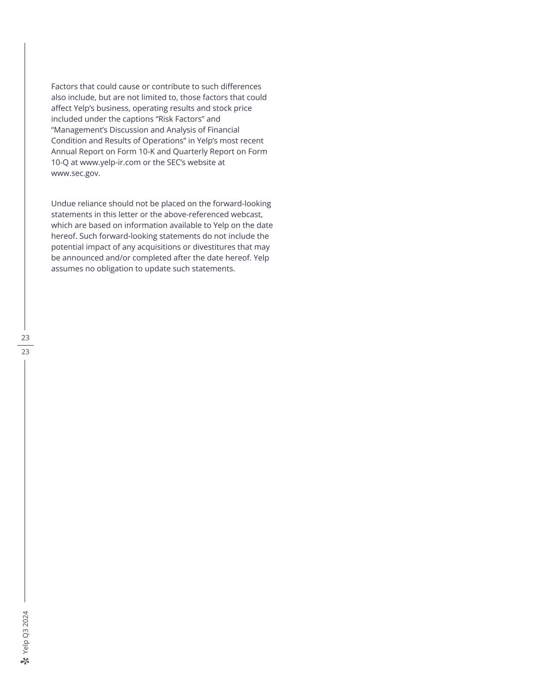 Ye lp Q 3 20 24 Factors that could cause or contribute to such differences also include, but are not limited to, those factors that could affect Yelp’s business, operating results and stock price included under the captions “Risk Factors” and “Management’s Discussion and Analysis of Financial Condition and Results of Operations” in Yelp’s most recent Annual Report on Form 10-K and Quarterly Report on Form 10-Q at www.yelp-ir.com or the SEC’s website at www.sec.gov. Undue reliance should not be placed on the forward-looking statements in this letter or the above-referenced webcast, which are based on information available to Yelp on the date hereof. Such forward-looking statements do not include the potential impact of any acquisitions or divestitures that may be announced and/or completed after the date hereof. Yelp assumes no obligation to update such statements. 23 23