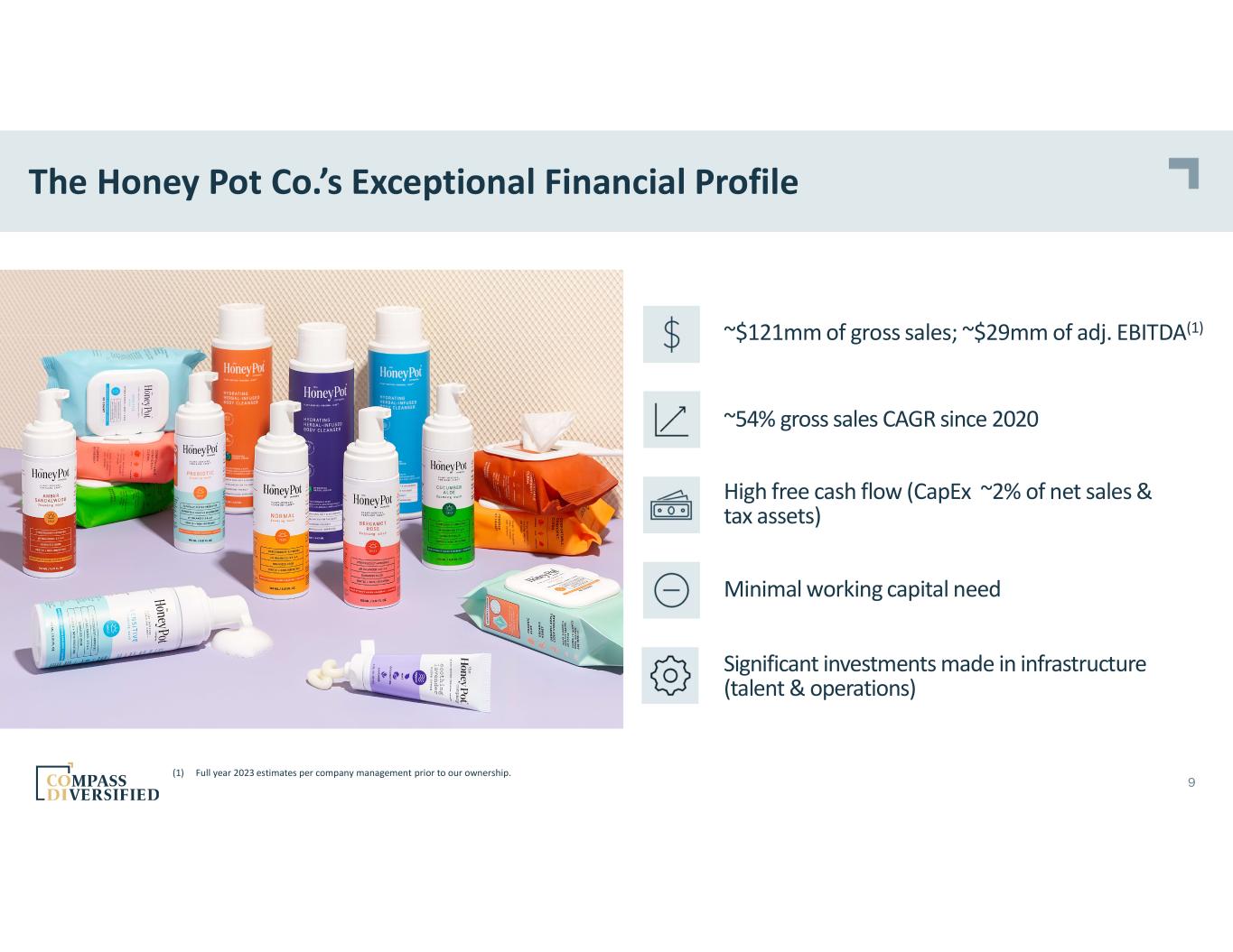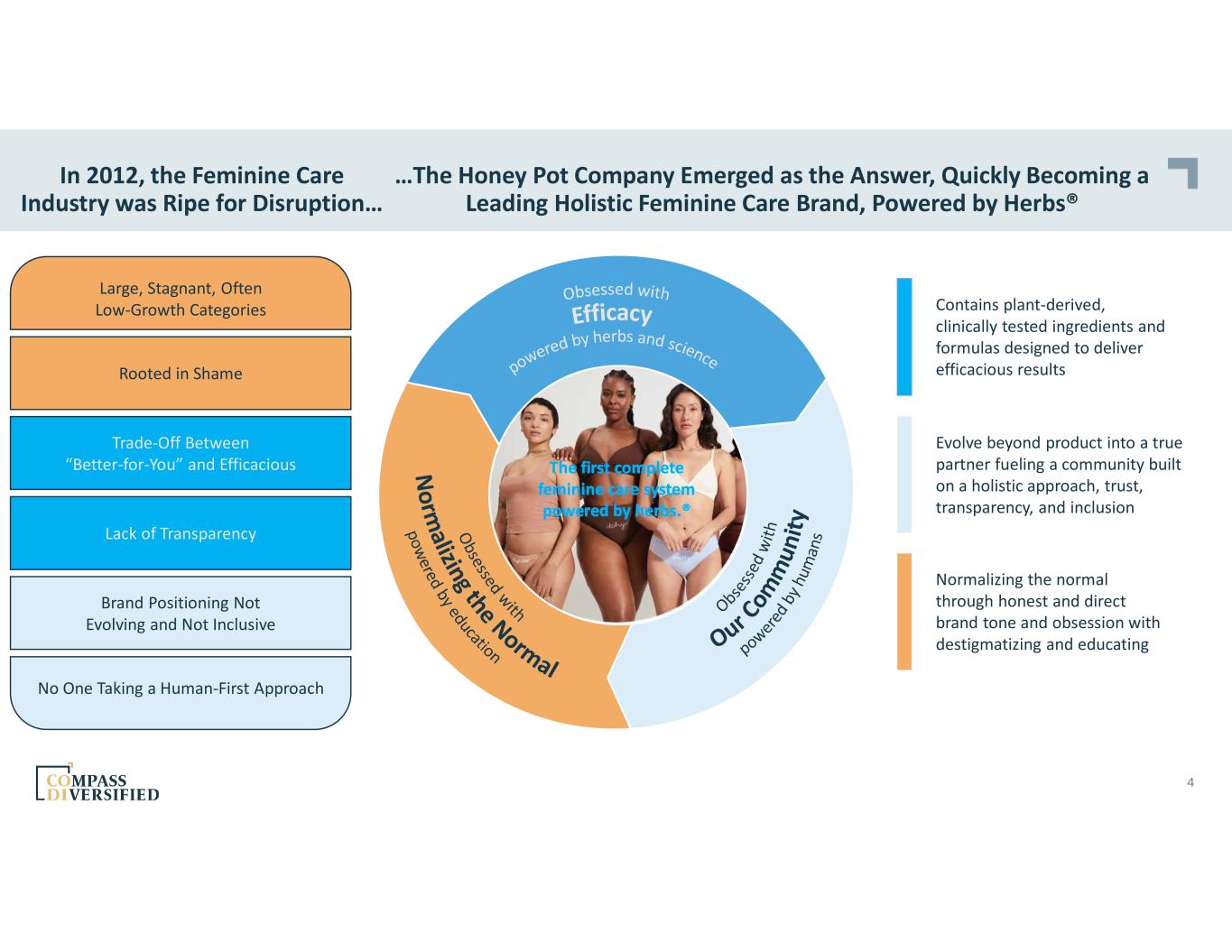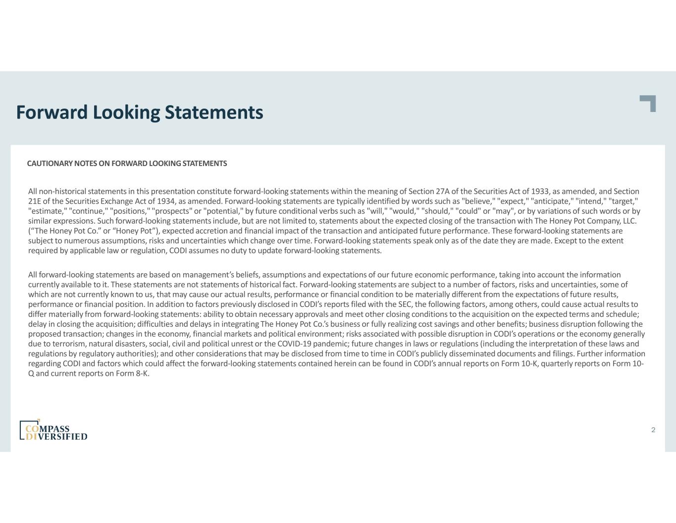 Forward Looking Statements CAUTIONARY NOTES ON FORWARD LOOKING STATEMENTS All non-historical statements in this presentation constitute forward-looking statements within the meaning of Section 27A of the Securities Act of 1933, as amended, and Section 21E of the Securities Exchange Act of 1934, as amended. Forward-looking statements are typically identified by words such as "believe," "expect," "anticipate," "intend," "target," "estimate," "continue," "positions," "prospects" or "potential," by future conditional verbs such as "will," "would," "should," "could" or "may", or by variations of such words or by similar expressions. Such forward-looking statements include, but are not limited to, statements about the expected closing of the transaction with The Honey Pot Company, LLC. (“The Honey Pot Co.” or “Honey Pot”), expected accretion and financial impact of the transaction and anticipated future performance. These forward-looking statements are subject to numerous assumptions, risks and uncertainties which change over time. Forward-looking statements speak only as of the date they are made. Except to the extent required by applicable law or regulation, CODI assumes no duty to update forward-looking statements. All forward-looking statements are based on management’s beliefs, assumptions and expectations of our future economic performance, taking into account the information currently available to it. These statements are not statements of historical fact. Forward-looking statements are subject to a number of factors, risks and uncertainties, some of which are not currently known to us, that may cause our actual results, performance or financial condition to be materially different from the expectations of future results, performance or financial position. In addition to factors previously disclosed in CODI’s reports filed with the SEC, the following factors, among others, could cause actual results to differ materially from forward-looking statements: ability to obtain necessary approvals and meet other closing conditions to the acquisition on the expected terms and schedule; delay in closing the acquisition; difficulties and delays in integrating The Honey Pot Co.’s business or fully realizing cost savings and other benefits; business disruption following the proposed transaction; changes in the economy, financial markets and political environment; risks associated with possible disruption in CODI’s operations or the economy generally due to terrorism, natural disasters, social, civil and political unrest or the COVID-19 pandemic; future changes in laws or regulations (including the interpretation of these laws and regulations by regulatory authorities); and other considerations that may be disclosed from time to time in CODI’s publicly disseminated documents and filings. Further information regarding CODI and factors which could affect the forward-looking statements contained herein can be found in CODI’s annual reports on Form 10-K, quarterly reports on Form 10- Q and current reports on Form 8-K. 2