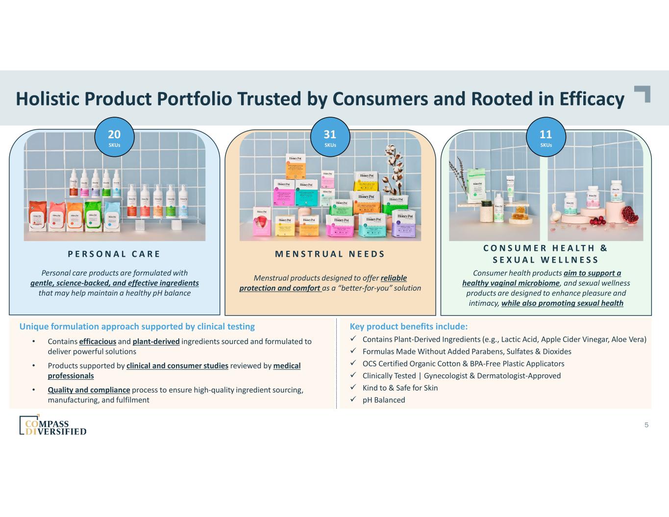 No One Taking a Human-First Approach Brand Positioning Not Evolving and Not Inclusive Lack of Transparency Trade-Off Between “Better-for-You” and Efficacious Rooted in Shame Large, Stagnant, Often Low-Growth Categories In 2012, the Feminine Care Industry was Ripe for Disruption… …The Honey Pot Company Emerged as the Answer, Quickly Becoming a Leading Holistic Feminine Care Brand, Powered by Herbs® The first complete feminine care system powered by herbs.® Contains plant-derived, clinically tested ingredients and formulas designed to deliver efficacious results Evolve beyond product into a true partner fueling a community built on a holistic approach, trust, transparency, and inclusion Normalizing the normal through honest and direct brand tone and obsession with destigmatizing and educating 4