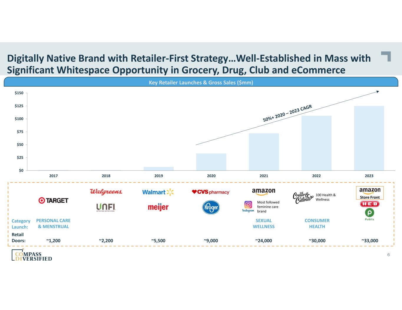 5 P E R S O N A L C A R E M E N S T R U A L N E E D S C O N S U M E R H E A L T H & S E X U A L W E L L N E S S Unique formulation approach supported by clinical testing • Contains efficacious and plant-derived ingredients sourced and formulated to deliver powerful solutions • Products supported by clinical and consumer studies reviewed by medical professionals • Quality and compliance process to ensure high-quality ingredient sourcing, manufacturing, and fulfilment Personal care products are formulated with gentle, science-backed, and effective ingredients that may help maintain a healthy pH balance Menstrual products designed to offer reliable protection and comfort as a “better-for-you” solution Consumer health products aim to support a healthy vaginal microbiome, and sexual wellness products are designed to enhance pleasure and intimacy, while also promoting sexual health Key product benefits include:  Contains Plant-Derived Ingredients (e.g., Lactic Acid, Apple Cider Vinegar, Aloe Vera)  Formulas Made Without Added Parabens, Sulfates & Dioxides  OCS Certified Organic Cotton & BPA-Free Plastic Applicators  Clinically Tested | Gynecologist & Dermatologist-Approved  Kind to & Safe for Skin  pH Balanced Holistic Product Portfolio Trusted by Consumers and Rooted in Efficacy SKUs 20 SKUs 31 SKUs 11
