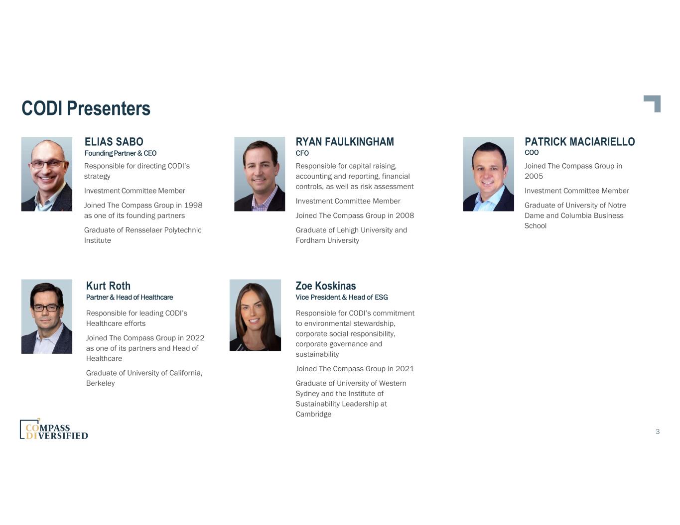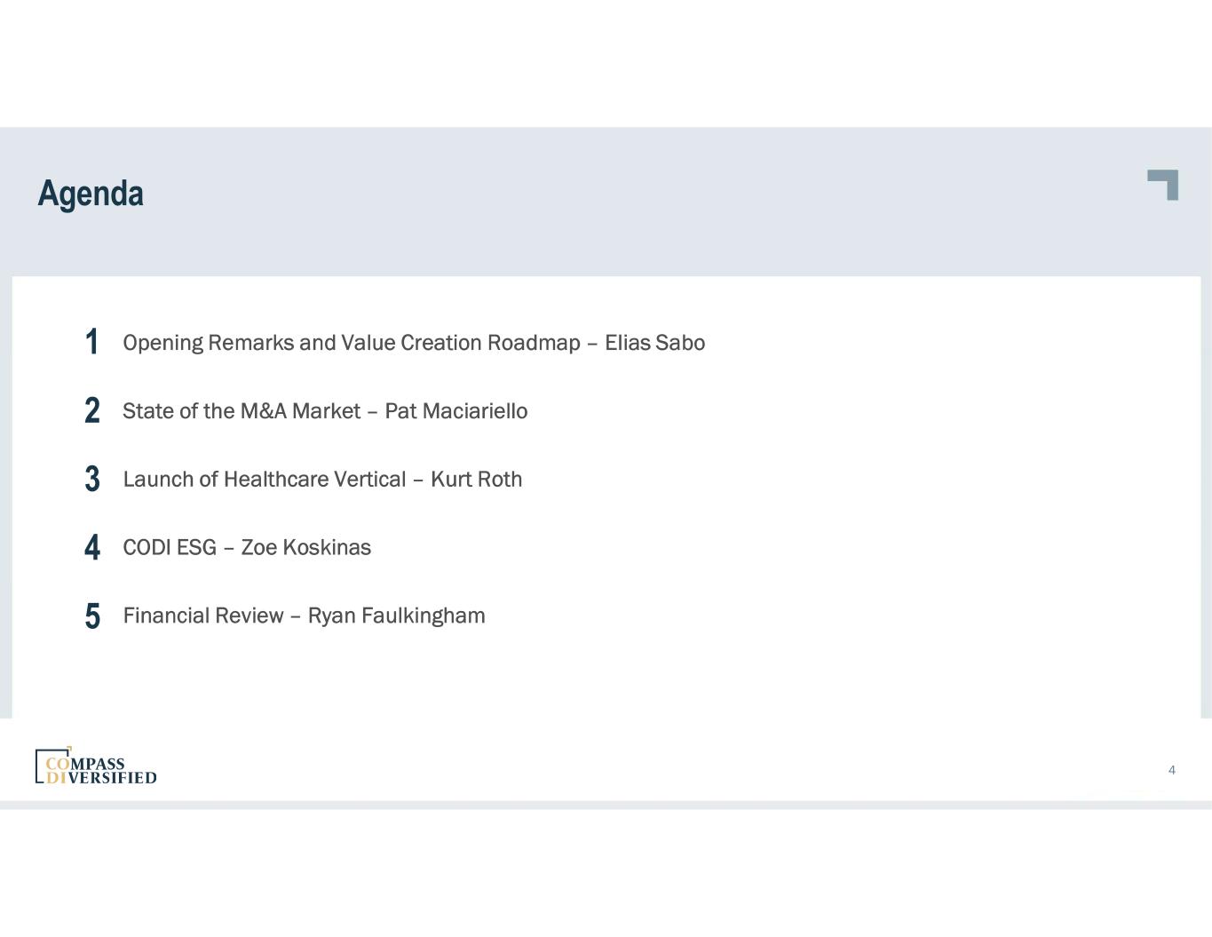 Agenda Opening Remarks and Value Creation Roadmap – Elias Sabo State of the M&A Market – Pat Maciariello Launch of Healthcare Vertical – Kurt Roth CODI ESG – Zoe Koskinas Financial Review – Ryan Faulkingham 4 3 4 1 5 2