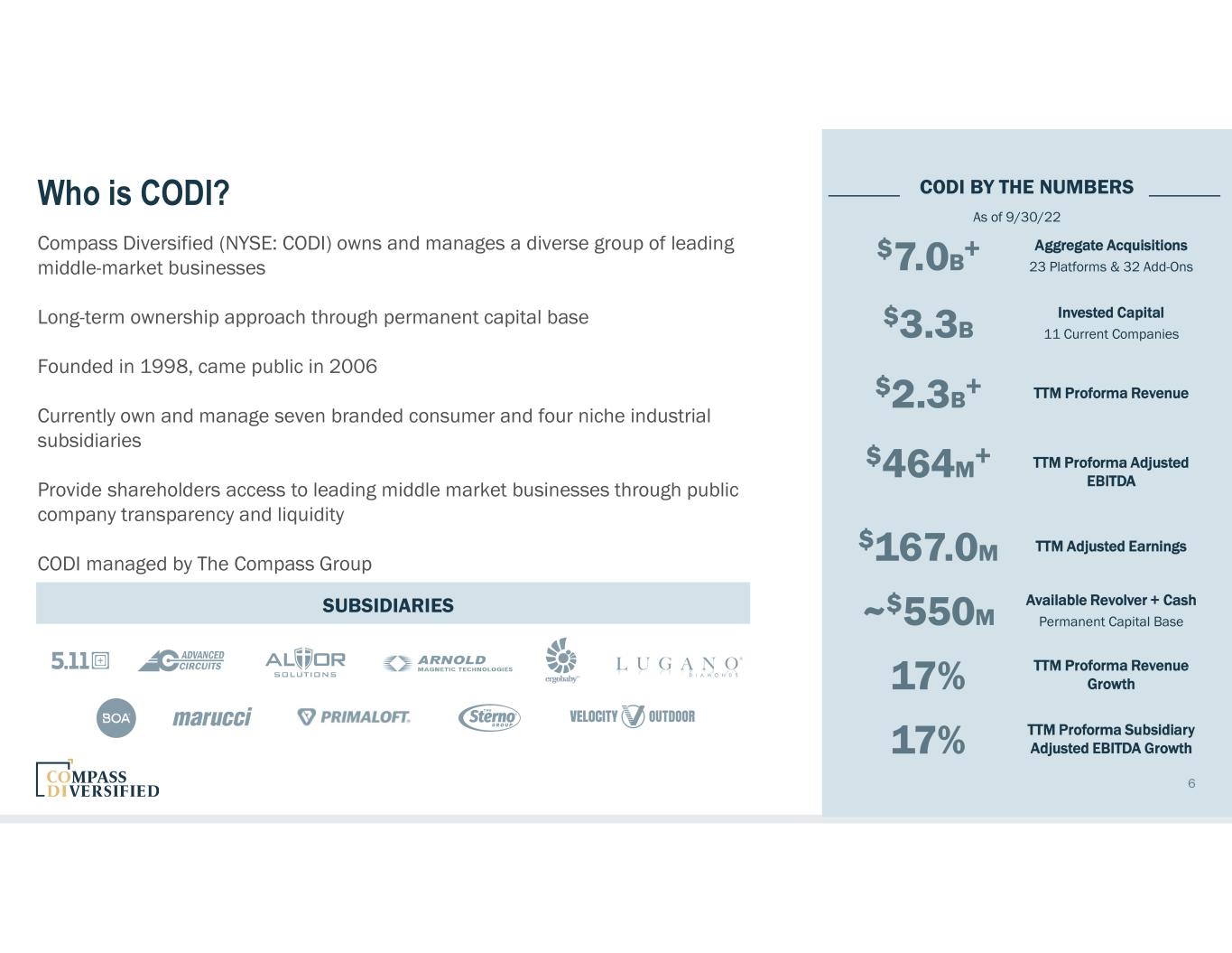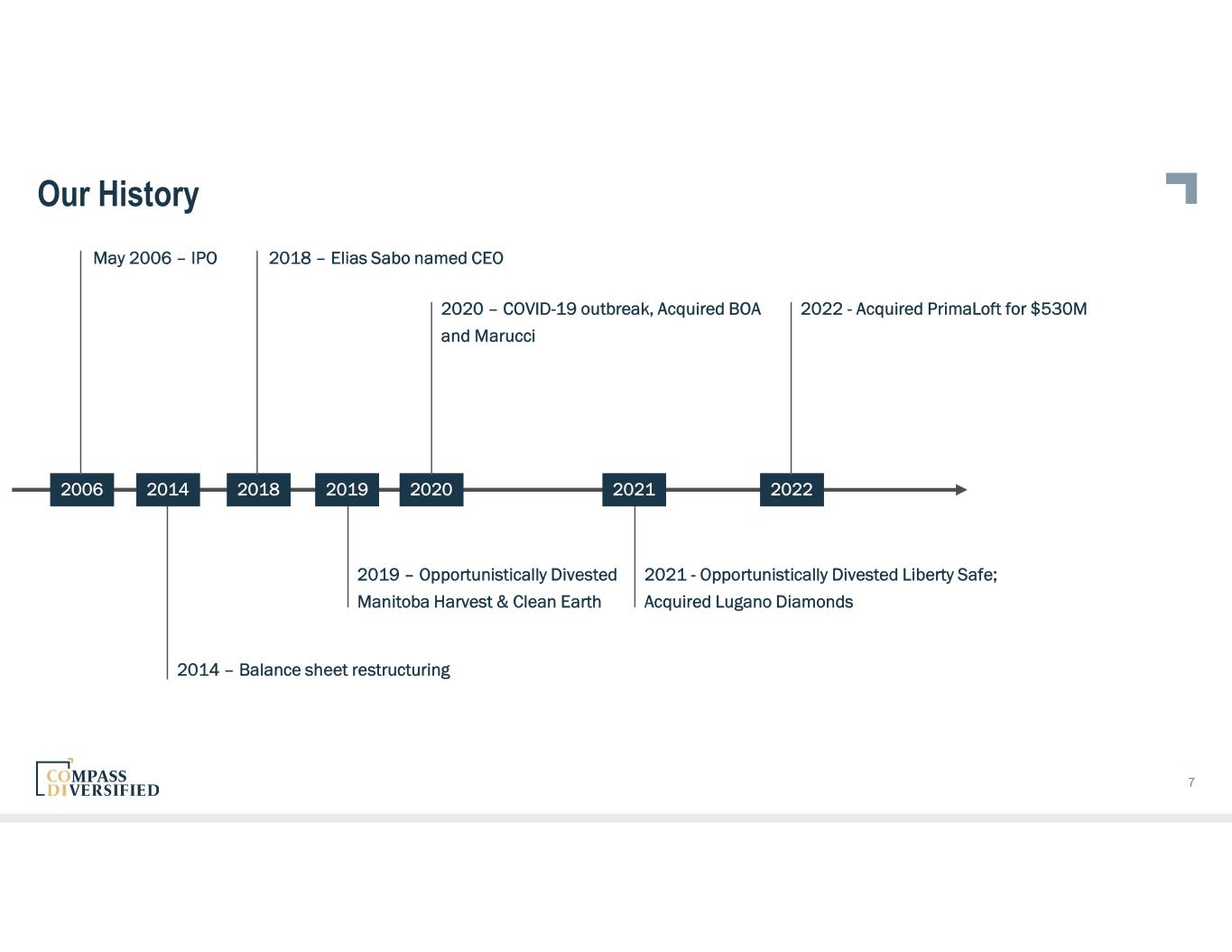 CODI BY THE NUMBERS $7.0B+ Aggregate Acquisitions 23 Platforms & 32 Add-Ons $3.3B Invested Capital 11 Current Companies $2.3B+ TTM Proforma Revenue $464M+ TTM Proforma Adjusted EBITDA $167.0M TTM Adjusted Earnings ~$550M Available Revolver + Cash Permanent Capital Base 17% TTM Proforma Revenue Growth 17% TTM Proforma Subsidiary Adjusted EBITDA Growth Who is CODI? Compass Diversified (NYSE: CODI) owns and manages a diverse group of leading middle-market businesses Long-term ownership approach through permanent capital base Founded in 1998, came public in 2006 Currently own and manage seven branded consumer and four niche industrial subsidiaries Provide shareholders access to leading middle market businesses through public company transparency and liquidity CODI managed by The Compass Group SUBSIDIARIES 6 As of 9/30/22
