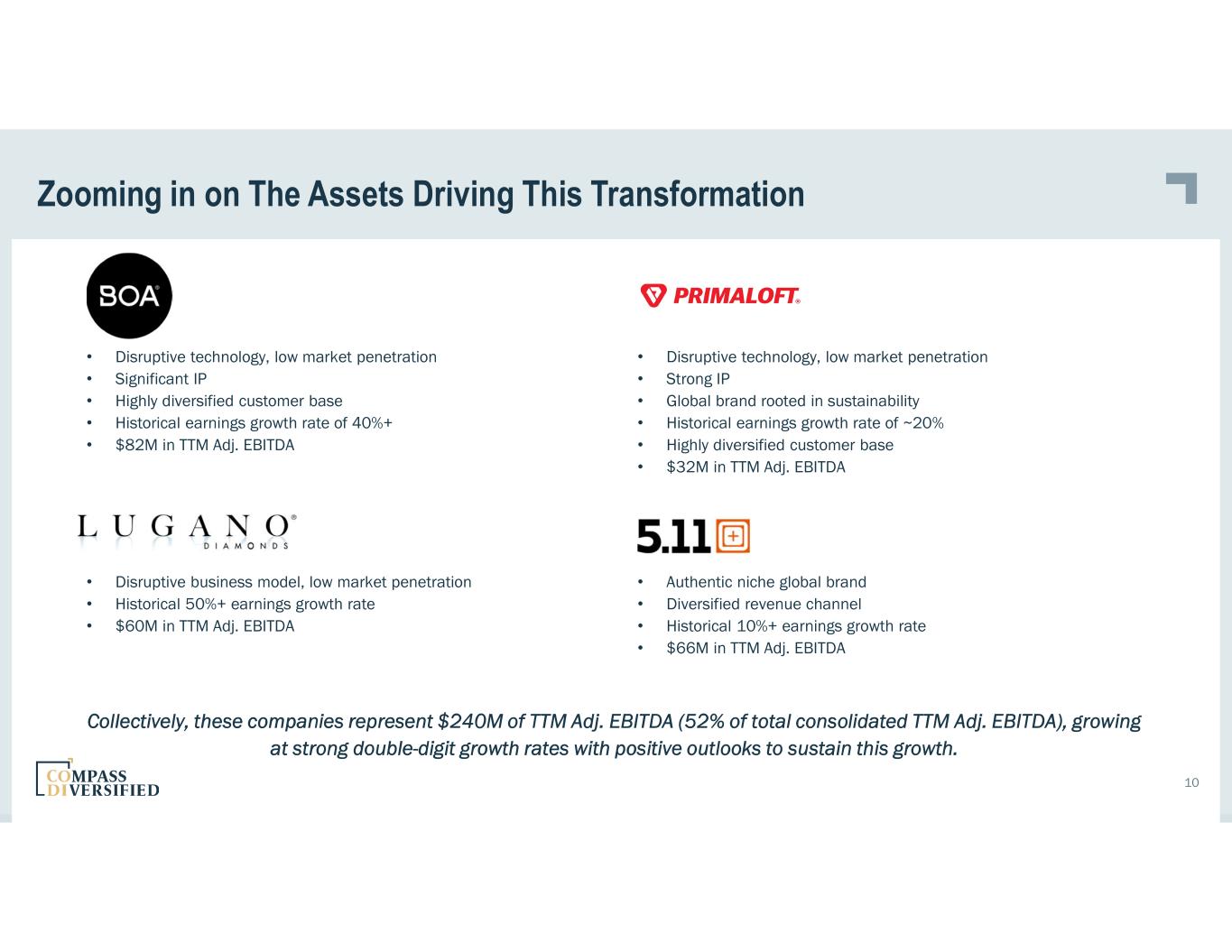 Our Business Transformation is Accelerating Our Core Growth Rate Pro Forma Subsidiary Growth Profile 9 1. Revenue, Adj. EBITDA, capex shown pro forma for acquisition of Lugano Diamonds and PrimaLoft and divestiture of Liberty Safe. 2. Growth capex at 5.11 for retail store rollout. 3. Subsidiary Adj. EBITDA does not include $52M of management fees and $17M corporate expenses. Subsidiaries ($ in millions) Year Acquired TTM AT 9/30/22(1) Purchase Price + Add-onsRevenue Revenue Growth Rate Subsidiary Adj. EBITDA Adj. EBITDA Growth Rate Adj. EBITDA Margin Capital Expenditures 2016 $475 8.0% $66 2% 14% $19(2) $400 2017 $245 -10% $39 -28% 16% $5 $268 2010 $93 10% $17 11% 18% $1 $168 2021 $180 75% $60 73% 33% $5 $268 2020 $154 47% $32 13% 21% $4 $249 2020 $211 42% $82 49% 39% $5 $454 2022 $78 32% $32 44% 40% - $530 Total Branded Consumer: $1,437 18% $328 19% 23% $39 2014 $357 -6% $43 -8% 12% $3 $347 2018 $257 58% $40 28% 16% $3 $321 2012 $154 24% $25 44% 16% $6 $165 2006 $90 3% $27 6% 30% - $100 Total Niche Industrial: $860 14% $136 12% 16% $12 Consolidated: $2,297 16.6% $464(3) 17.0% 20% $51 $3,270 Operating cash flow margin18%