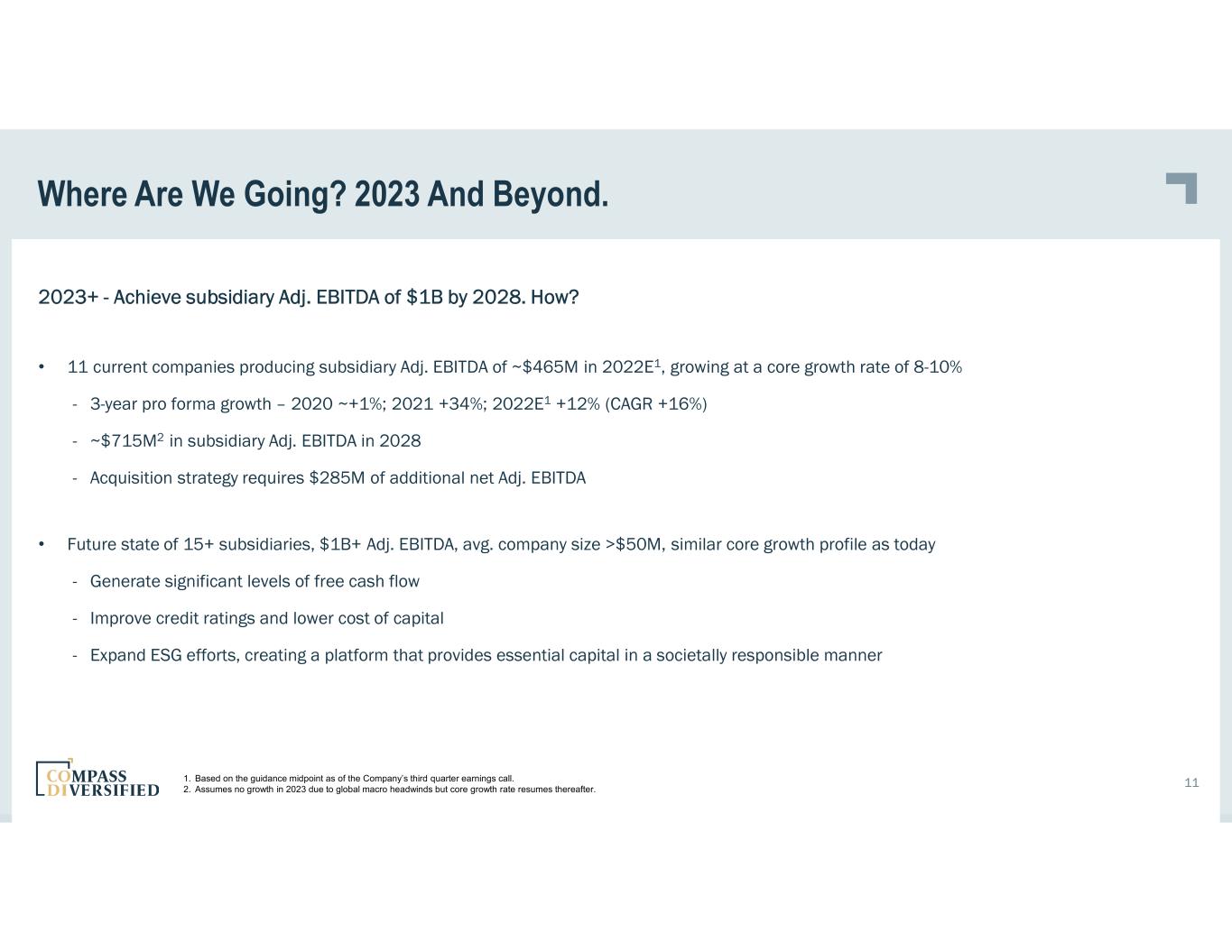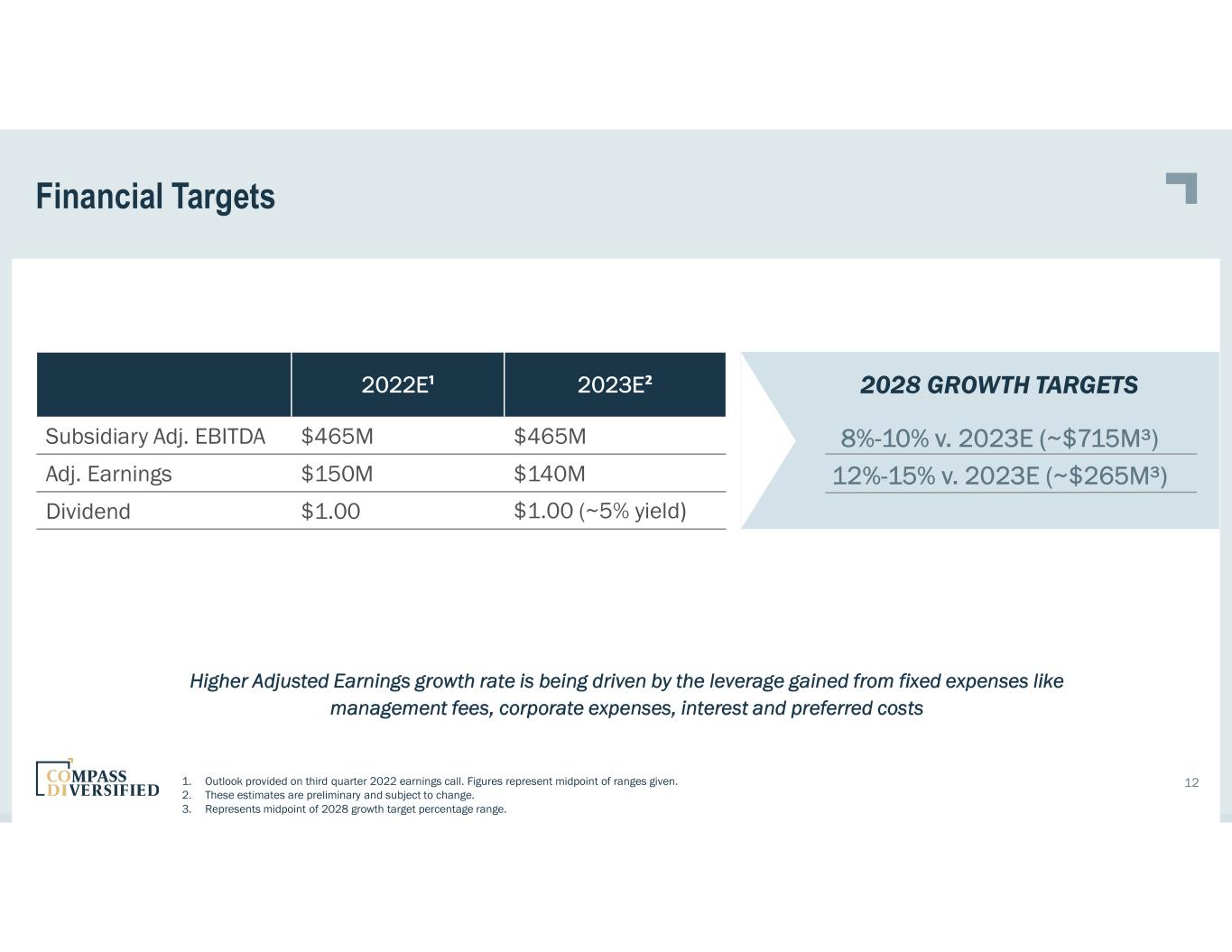 Where Are We Going? 2023 And Beyond. 11 2023+ - Achieve subsidiary Adj. EBITDA of $1B by 2028. How? • 11 current companies producing subsidiary Adj. EBITDA of ~$465M in 2022E1, growing at a core growth rate of 8-10% - 3-year pro forma growth – 2020 ~+1%; 2021 +34%; 2022E1 +12% (CAGR +16%) - ~$715M2 in subsidiary Adj. EBITDA in 2028 - Acquisition strategy requires $285M of additional net Adj. EBITDA • Future state of 15+ subsidiaries, $1B+ Adj. EBITDA, avg. company size >$50M, similar core growth profile as today - Generate significant levels of free cash flow - Improve credit ratings and lower cost of capital - Expand ESG efforts, creating a platform that provides essential capital in a societally responsible manner 1. Based on the guidance midpoint as of the Company’s third quarter earnings call. 2. Assumes no growth in 2023 due to global macro headwinds but core growth rate resumes thereafter.