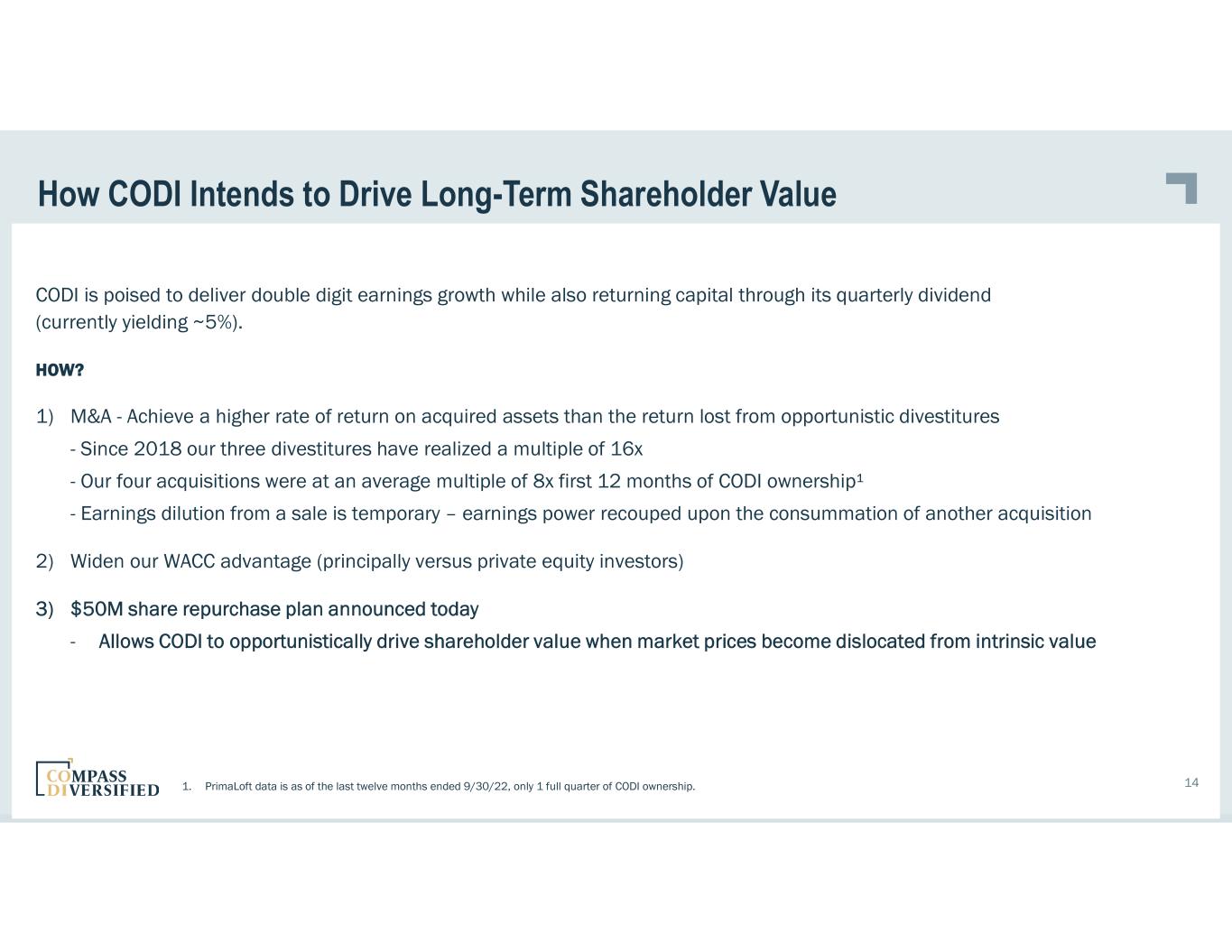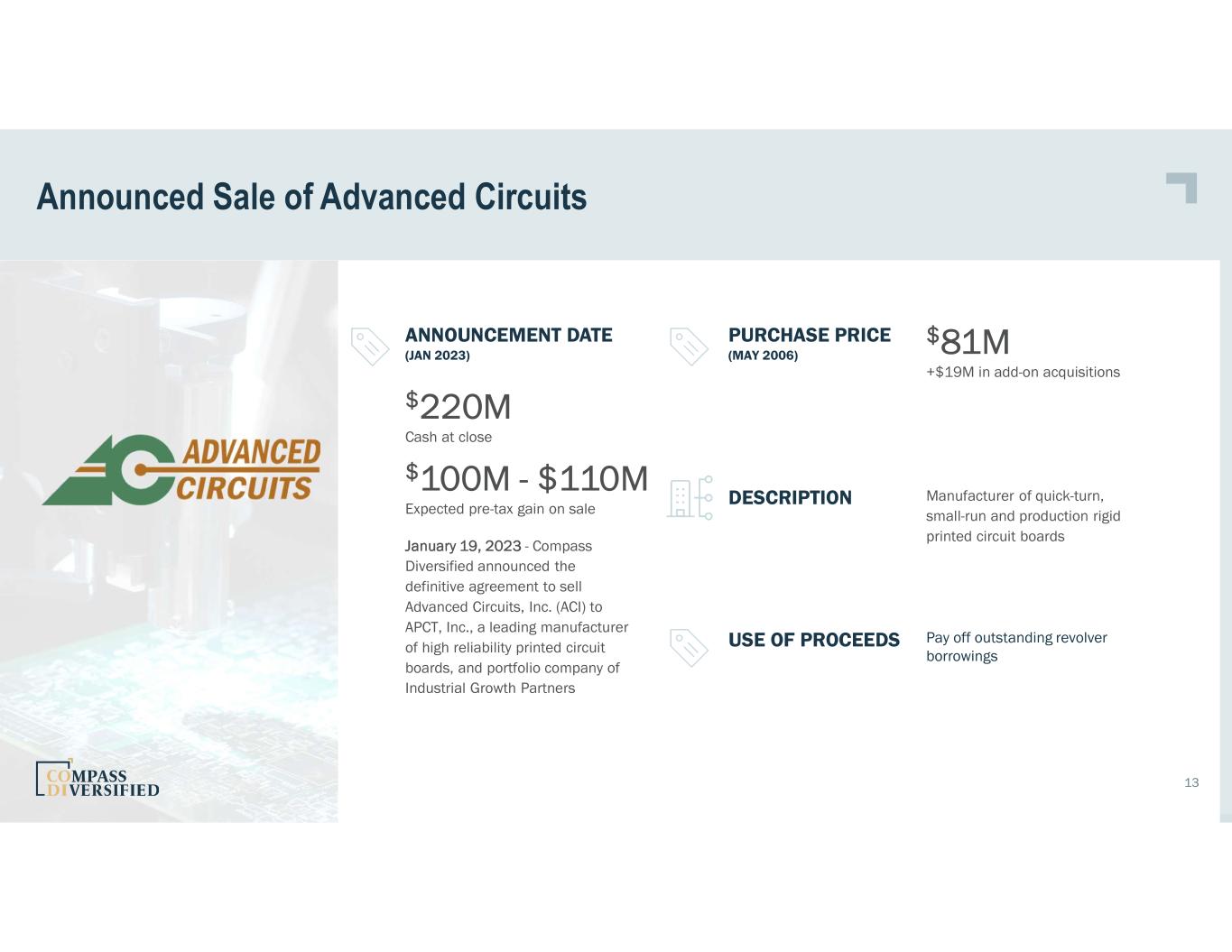 Announced Sale of Advanced Circuits PURCHASE PRICE (MAY 2006) $81M +$19M in add-on acquisitions DESCRIPTION Manufacturer of quick-turn, small-run and production rigid printed circuit boards ANNOUNCEMENT DATE (JAN 2023) January 19, 2023 - Compass Diversified announced the definitive agreement to sell Advanced Circuits, Inc. (ACI) to APCT, Inc., a leading manufacturer of high reliability printed circuit boards, and portfolio company of Industrial Growth Partners $220M Cash at close $100M - $110M Expected pre-tax gain on sale Pay off outstanding revolver borrowings USE OF PROCEEDS 13