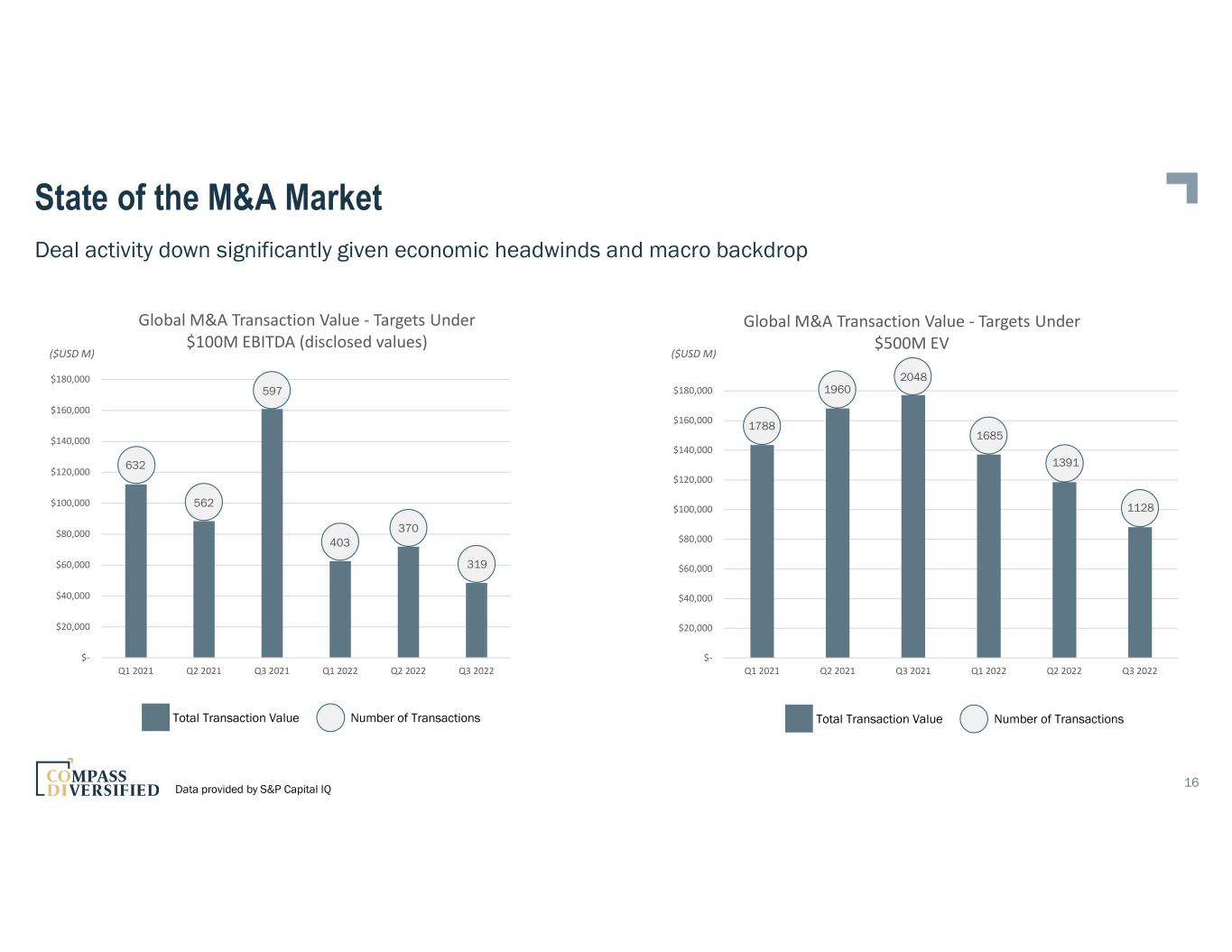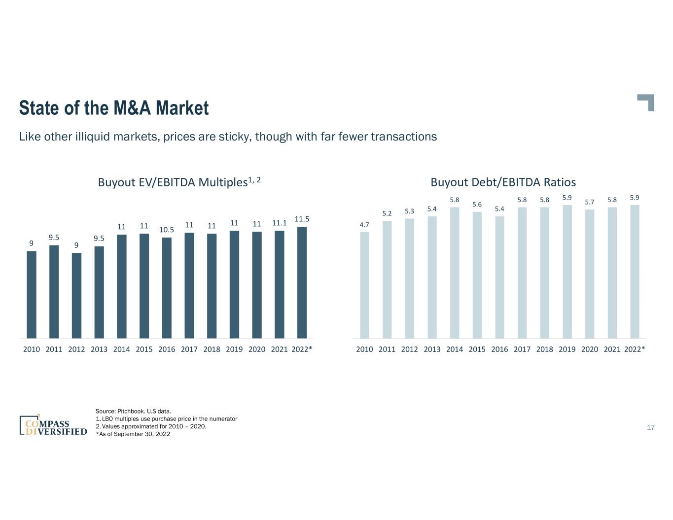 State of the M&A Market 16 $- $20,000 $40,000 $60,000 $80,000 $100,000 $120,000 $140,000 $160,000 $180,000 Q1 2021 Q2 2021 Q3 2021 Q1 2022 Q2 2022 Q3 2022 Global M&A Transaction Value - Targets Under $500M EV Data provided by S&P Capital IQ $- $20,000 $40,000 $60,000 $80,000 $100,000 $120,000 $140,000 $160,000 $180,000 Q1 2021 Q2 2021 Q3 2021 Q1 2022 Q2 2022 Q3 2022 Global M&A Transaction Value - Targets Under $100M EBITDA (disclosed values) Total Transaction Value Number of Transactions 632 403 370 319 597 562 1788 1685 1391 1128 2048 1960 ($USD M) Total Transaction Value Number of Transactions Deal activity down significantly given economic headwinds and macro backdrop ($USD M)
