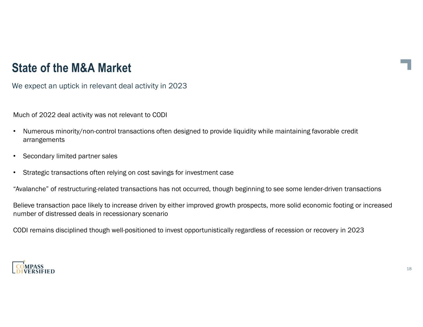 State of the M&A Market 17 Source: Pitchbook. U.S data. 1. LBO multiples use purchase price in the numerator 2. Values approximated for 2010 – 2020. *As of September 30, 2022 Like other illiquid markets, prices are sticky, though with far fewer transactions 9 9.5 9 9.5 11 11 10.5 11 11 11 11 11.1 11.5 2010 2011 2012 2013 2014 2015 2016 2017 2018 2019 2020 2021 2022* Buyout EV/EBITDA Multiples1, 2 4.7 5.2 5.3 5.4 5.8 5.6 5.4 5.8 5.8 5.9 5.7 5.8 5.9 2010 2011 2012 2013 2014 2015 2016 2017 2018 2019 2020 2021 2022* Buyout Debt/EBITDA Ratios