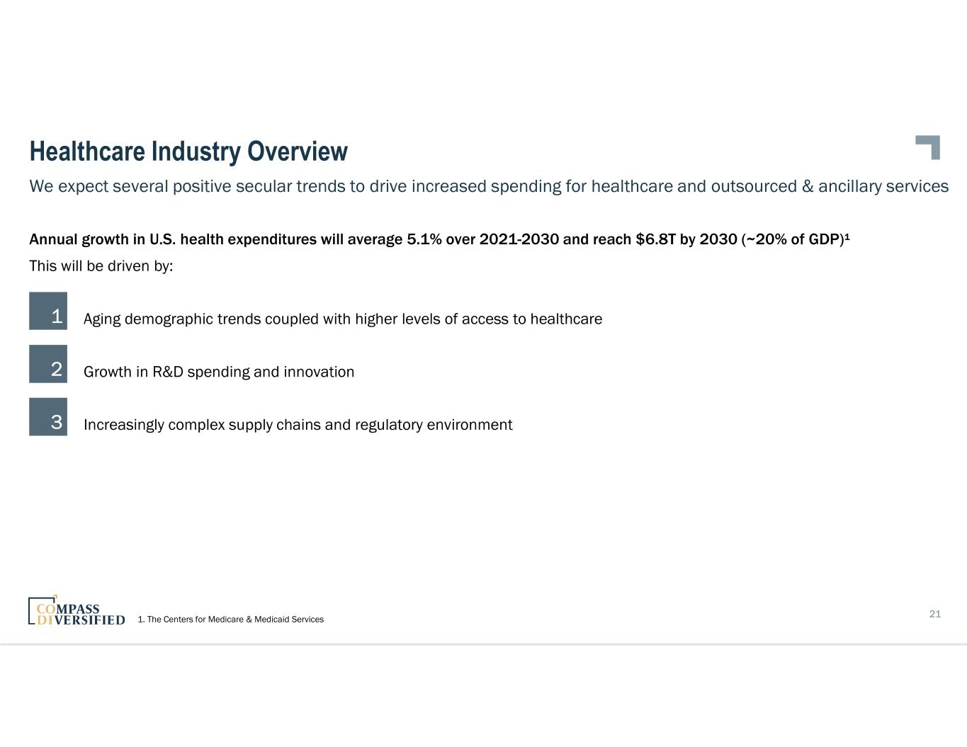 21 We expect several positive secular trends to drive increased spending for healthcare and outsourced & ancillary services Healthcare Industry Overview Annual growth in U.S. health expenditures will average 5.1% over 2021-2030 and reach $6.8T by 2030 (~20% of GDP)¹ This will be driven by: Aging demographic trends coupled with higher levels of access to healthcare Growth in R&D spending and innovation Increasingly complex supply chains and regulatory environment3 2 1 1. The Centers for Medicare & Medicaid Services