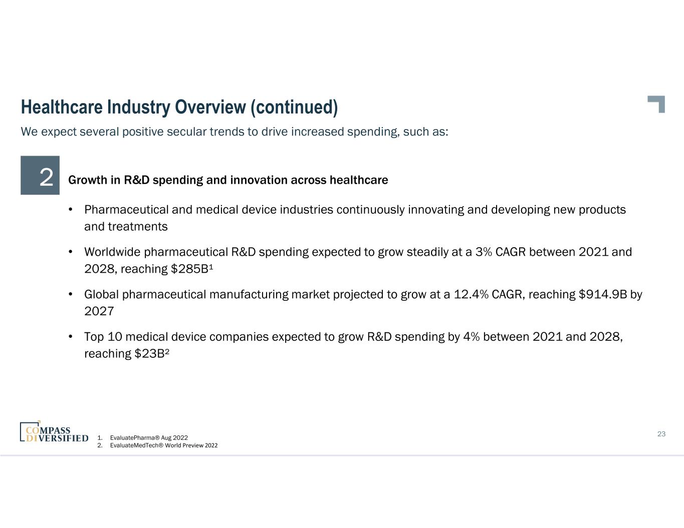 22 Healthcare Industry Overview (continued) Aging demographic trends coupled with higher levels of access to healthcare • Healthcare demand is increasing globally • World population expected to increase by nearly 2.0B in the next 30 years, from 8.0B to 9.7B in 2050¹ • One in six people are projected to be over 65 by 2050, up from one in eleven in 2019¹ • Percentage of U.S. population without access to healthcare insurance was 8.3% in 2021, down from 13.3% in 2013² We expect several positive secular trends to drive increased spending, such as: 1 1. The Centers for Medicare & Medicaid Services 2. U.S. Census Bureau