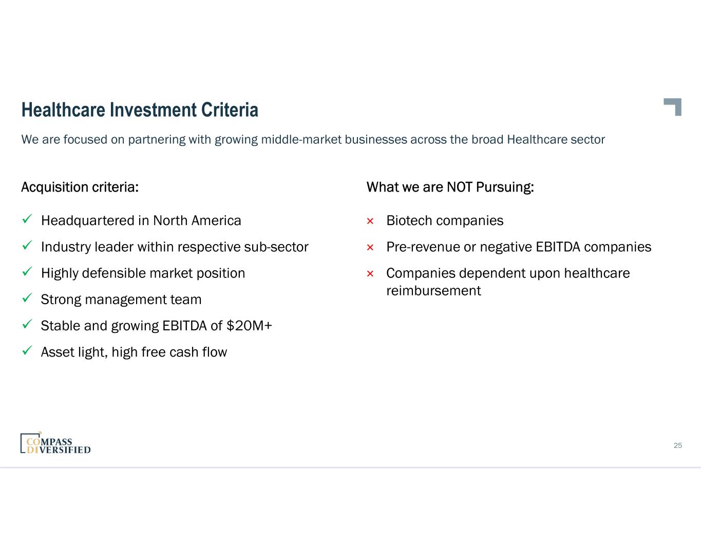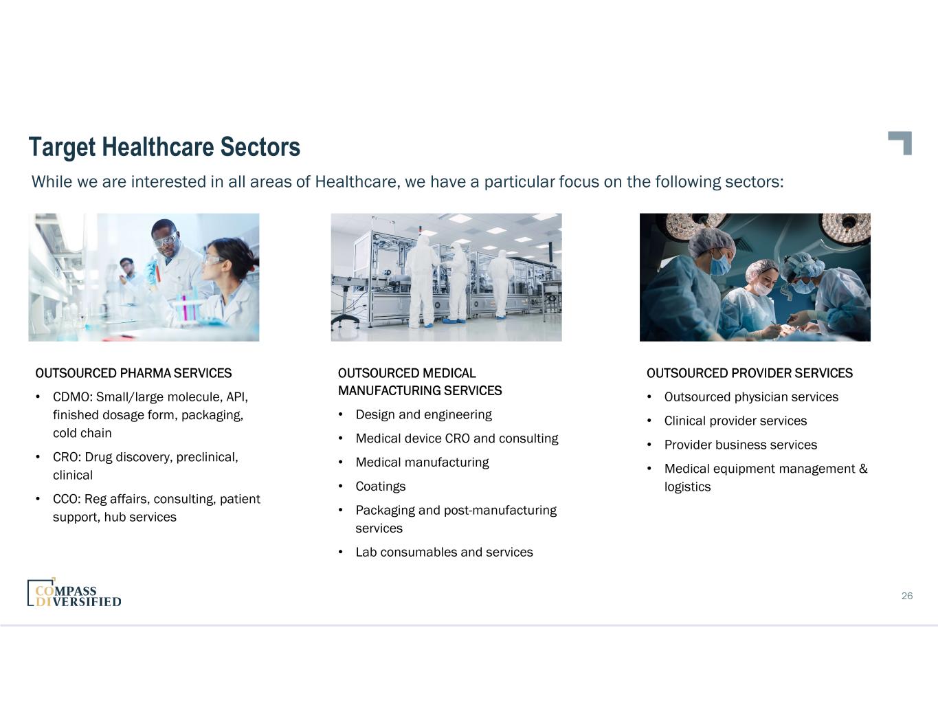 25 We are focused on partnering with growing middle-market businesses across the broad Healthcare sector Healthcare Investment Criteria Acquisition criteria:  Headquartered in North America  Industry leader within respective sub-sector  Highly defensible market position  Strong management team  Stable and growing EBITDA of $20M+  Asset light, high free cash flow What we are NOT Pursuing: × Biotech companies × Pre-revenue or negative EBITDA companies × Companies dependent upon healthcare reimbursement