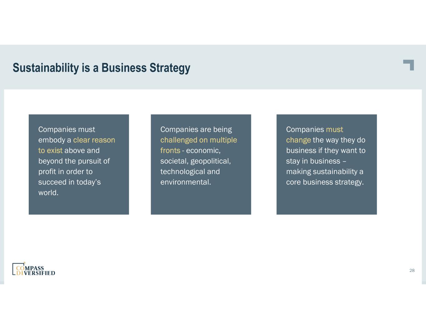 Sustainability is a Business Strategy 28 Companies must embody a clear reason to exist above and beyond the pursuit of profit in order to succeed in today’s world. Companies are being challenged on multiple fronts - economic, societal, geopolitical, technological and environmental. Companies must change the way they do business if they want to stay in business – making sustainability a core business strategy.