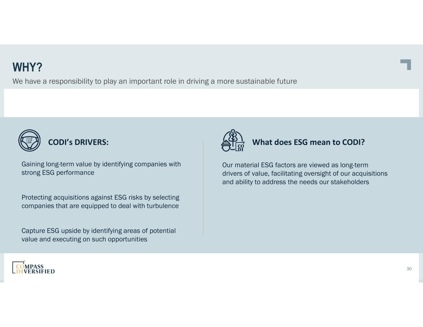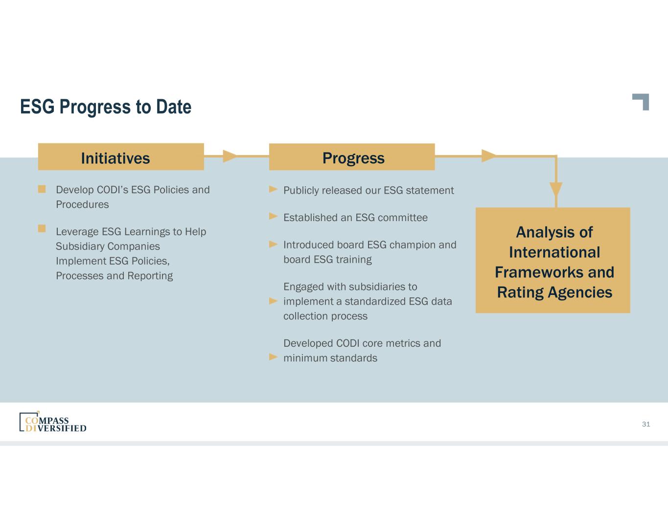 WHY? We have a responsibility to play an important role in driving a more sustainable future 30 CODI’s DRIVERS: Gaining long-term value by identifying companies with strong ESG performance Protecting acquisitions against ESG risks by selecting companies that are equipped to deal with turbulence Capture ESG upside by identifying areas of potential value and executing on such opportunities What does ESG mean to CODI? Our material ESG factors are viewed as long-term drivers of value, facilitating oversight of our acquisitions and ability to address the needs our stakeholders