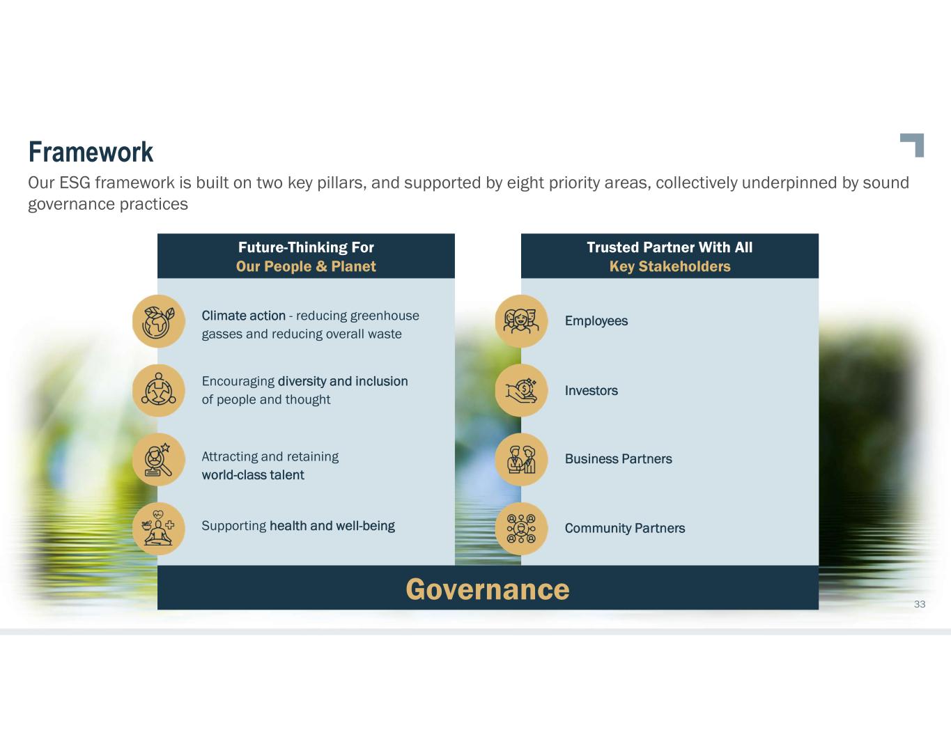 ESG Framework Design Apply a more holistic and adaptable approach to our investment thesis Sets the parameter for our company leaders to make informed decisions Allows for subsidiary adaptation and customization Aligns with our culture of enhancing long-term returns that benefit people and planet Manage risk quickly and capitalize on bigger opportunities Dynamic and allows for engagement 32