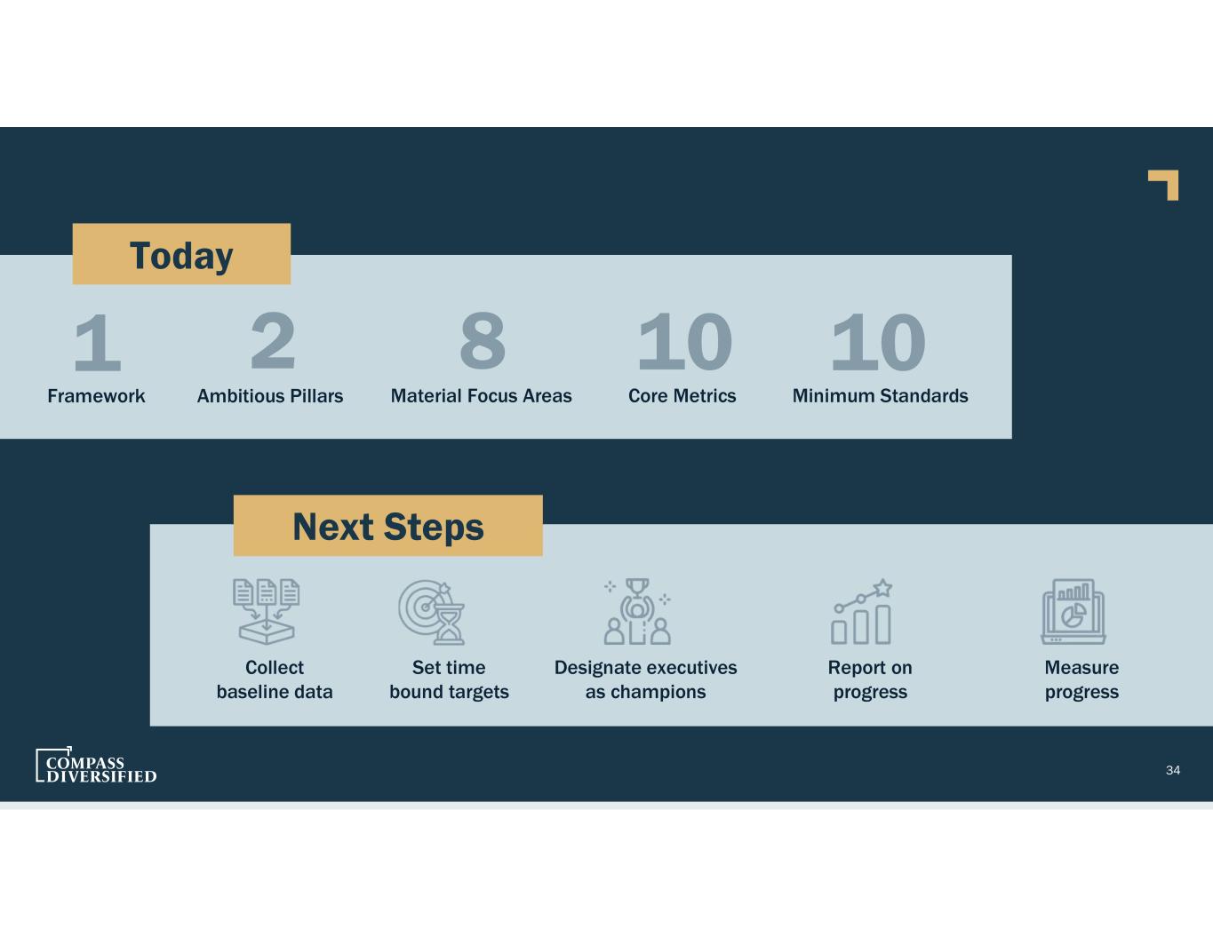 Today Framework 1 Ambitious Pillars 2 Material Focus Areas 8 Core Metrics Minimum Standards 10 10 Next Steps Measure progress Designate executives as champions Set time bound targets Collect baseline data Report on progress 34