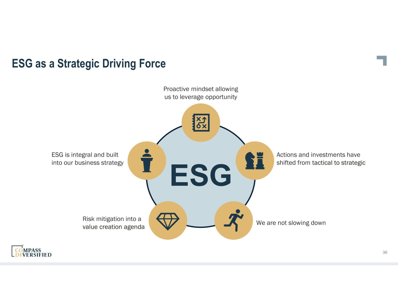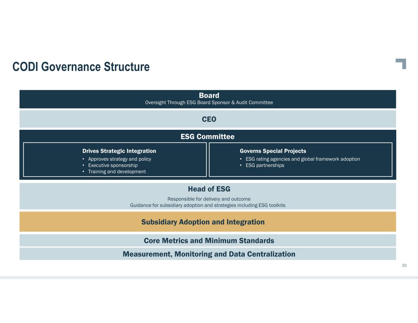 ESG Committee CODI Governance Structure Oversight Through ESG Board Sponsor & Audit Committee Drives Strategic Integration • Approves strategy and policy • Executive sponsorship • Training and development Governs Special Projects • ESG rating agencies and global framework adoption • ESG partnerships Core Metrics and Minimum Standards Measurement, Monitoring and Data Centralization Responsible for delivery and outcome Guidance for subsidiary adoption and strategies including ESG toolkits Subsidiary Adoption and Integration Head of ESG Board CEO 35