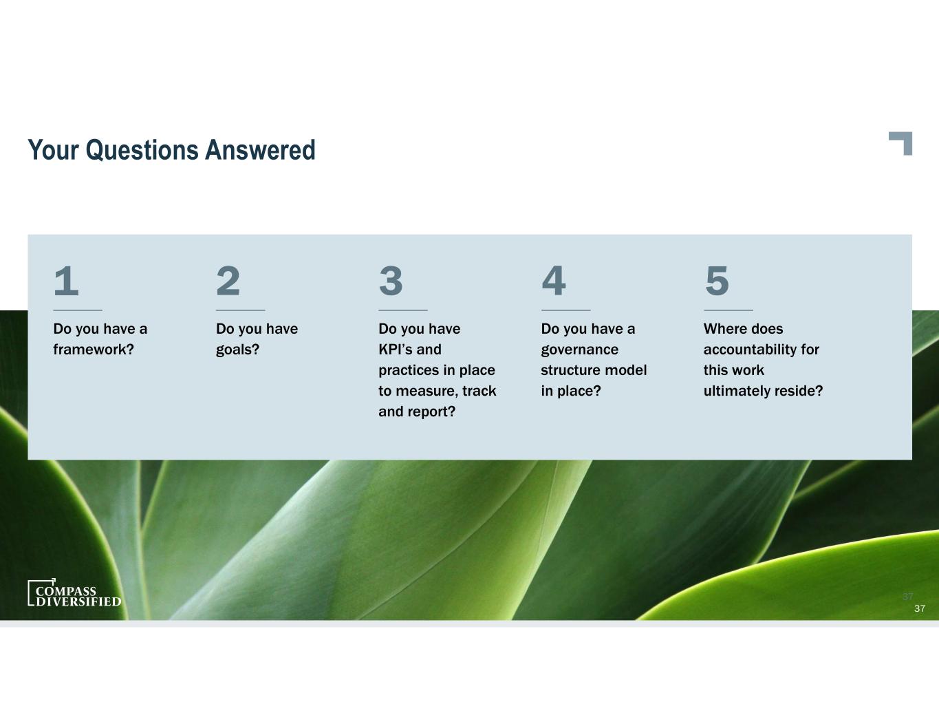 Your Questions Answered Do you have a framework? 1 2 3 37 4 5 Do you have goals? Do you have KPI’s and practices in place to measure, track and report? Do you have a governance structure model in place? Where does accountability for this work ultimately reside? 37