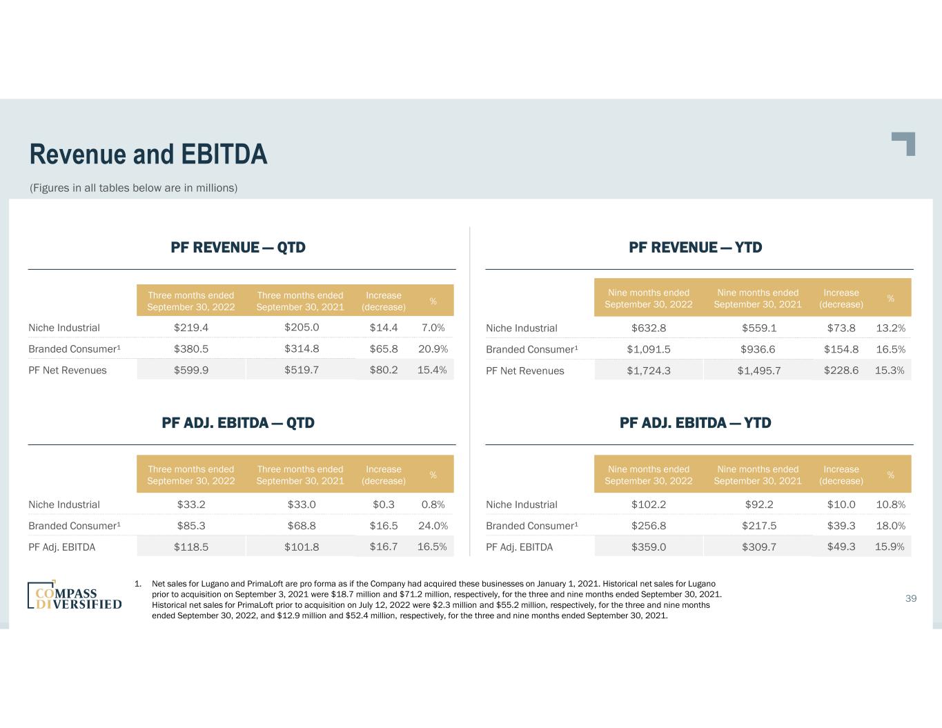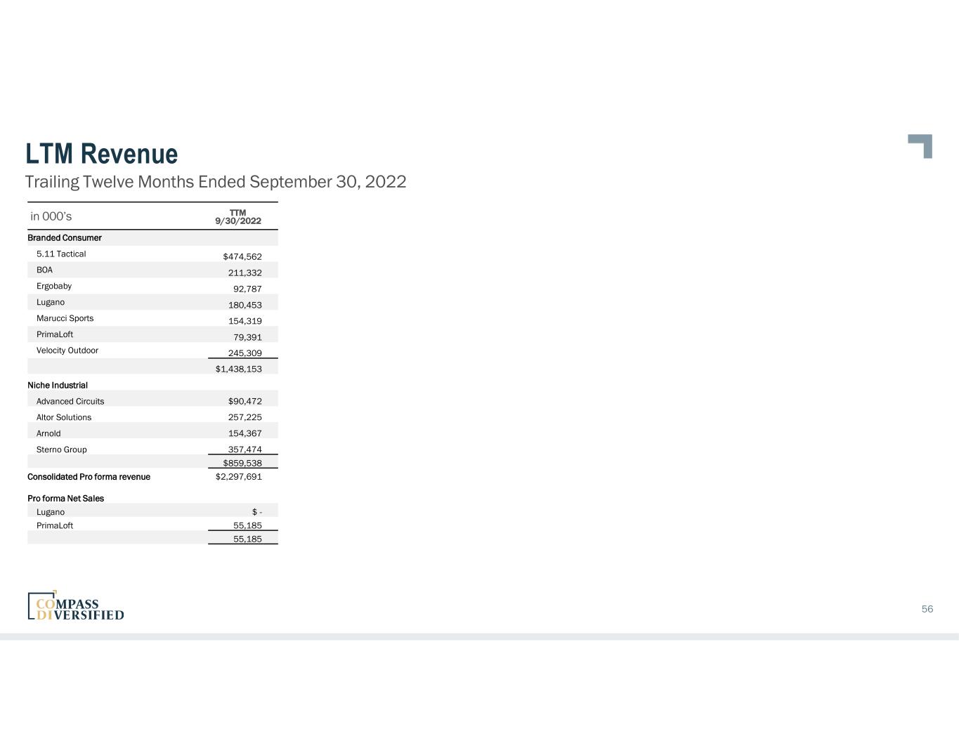 LTM Revenue Trailing Twelve Months Ended September 30, 2022 in 000’s TTM 9/30/2022 Branded Consumer 5.11 Tactical $474,562 BOA 211,332 Ergobaby 92,787 Lugano 180,453 Marucci Sports 154,319 PrimaLoft 79,391 Velocity Outdoor 245,309 $1,438,153 Niche Industrial Advanced Circuits $90,472 Altor Solutions 257,225 Arnold 154,367 Sterno Group 357,474 $859,538 Consolidated Pro forma revenue $2,297,691 Pro forma Net Sales Lugano $ - PrimaLoft 55,185 55,185 56