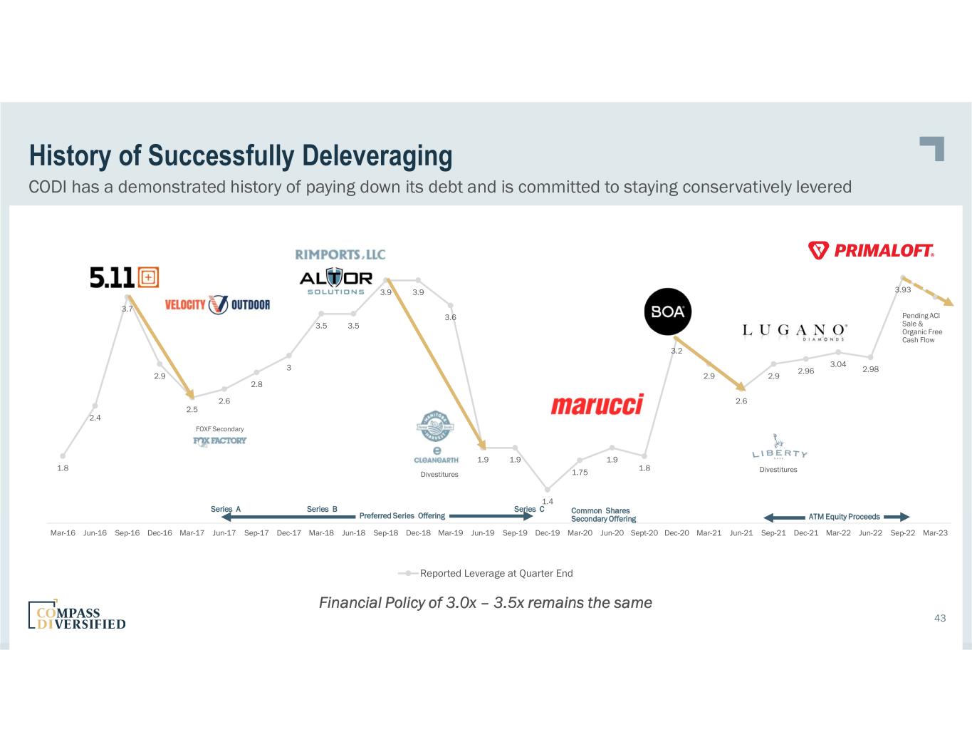 43 History of Successfully Deleveraging CODI has a demonstrated history of paying down its debt and is committed to staying conservatively levered 1.8 2.4 3.7 2.9 2.5 2.6 2.8 3 3.5 3.5 3.9 3.9 3.6 1.9 1.9 1.4 1.75 1.9 1.8 3.2 2.9 2.6 2.9 2.96 3.04 2.98 3.93 Mar-16 Jun-16 Sep-16 Dec-16 Mar-17 Jun-17 Sep-17 Dec-17 Mar-18 Jun-18 Sep-18 Dec-18 Mar-19 Jun-19 Sep-19 Dec-19 Mar-20 Jun-20 Sept-20 Dec-20 Mar-21 Jun-21 Sep-21 Dec-21 Mar-22 Jun-22 Sep-22 Mar-23 Reported Leverage at Quarter End FOXF Secondary Divestitures Divestitures Preferred Series Offering Pending ACI Sale & Organic Free Cash Flow Common Shares Secondary Offering ATM Equity Proceeds Series A Series B Series C Financial Policy of 3.0x – 3.5x remains the same 43