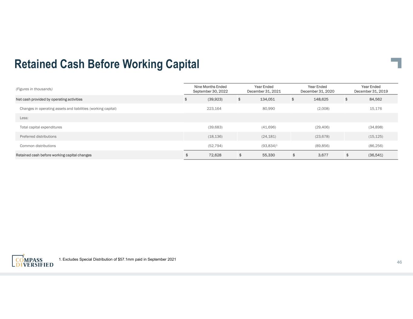 Retained Cash Before Working Capital 46 (Figures in thousands) Nine Months Ended September 30, 2022 Year Ended December 31, 2021 Year Ended December 31, 2020 Year Ended December 31, 2019 Net cash provided by operating activities $ (39,923) $ 134,051 $ 148,625 $ 84,562 Changes in operating assets and liabilities (working capital) 223,164 80,990 (2,008) 15,176 Less: Total capital expenditures (39,683) (41,696) (29,406) (34,898) Preferred distributions (18,136) (24,181) (23,678) (15,125) Common distributions (52,794) (93,834)1 (89,856) (86,256) Retained cash before working capital changes $ 72,628 $ 55,330 $ 3,677 $ (36,541) 1. Excludes Special Distribution of $57.1mm paid in September 2021