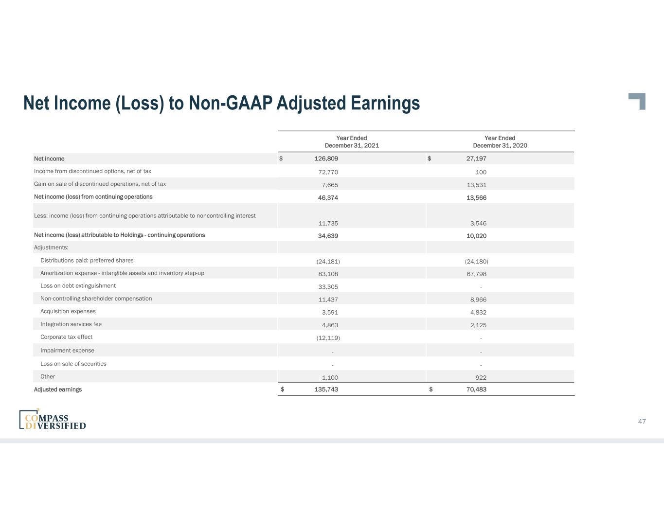 Net Income (Loss) to Non-GAAP Adjusted Earnings 47 Year Ended December 31, 2021 Year Ended December 31, 2020 Net income $ 126,809 $ 27,197 Income from discontinued options, net of tax 72,770 100 Gain on sale of discontinued operations, net of tax 7,665 13,531 Net income (loss) from continuing operations 46,374 13,566 Less: income (loss) from continuing operations attributable to noncontrolling interest 11,735 3,546 Net income (loss) attributable to Holdings - continuing operations 34,639 10,020 Adjustments: Distributions paid: preferred shares (24,181) (24,180) Amortization expense - intangible assets and inventory step-up 83,108 67,798 Loss on debt extinguishment 33,305 - Non-controlling shareholder compensation 11,437 8,966 Acquisition expenses 3,591 4,832 Integration services fee 4,863 2,125 Corporate tax effect (12,119) - Impairment expense - - Loss on sale of securities - - Other 1,100 922 Adjusted earnings $ 135,743 $ 70,483