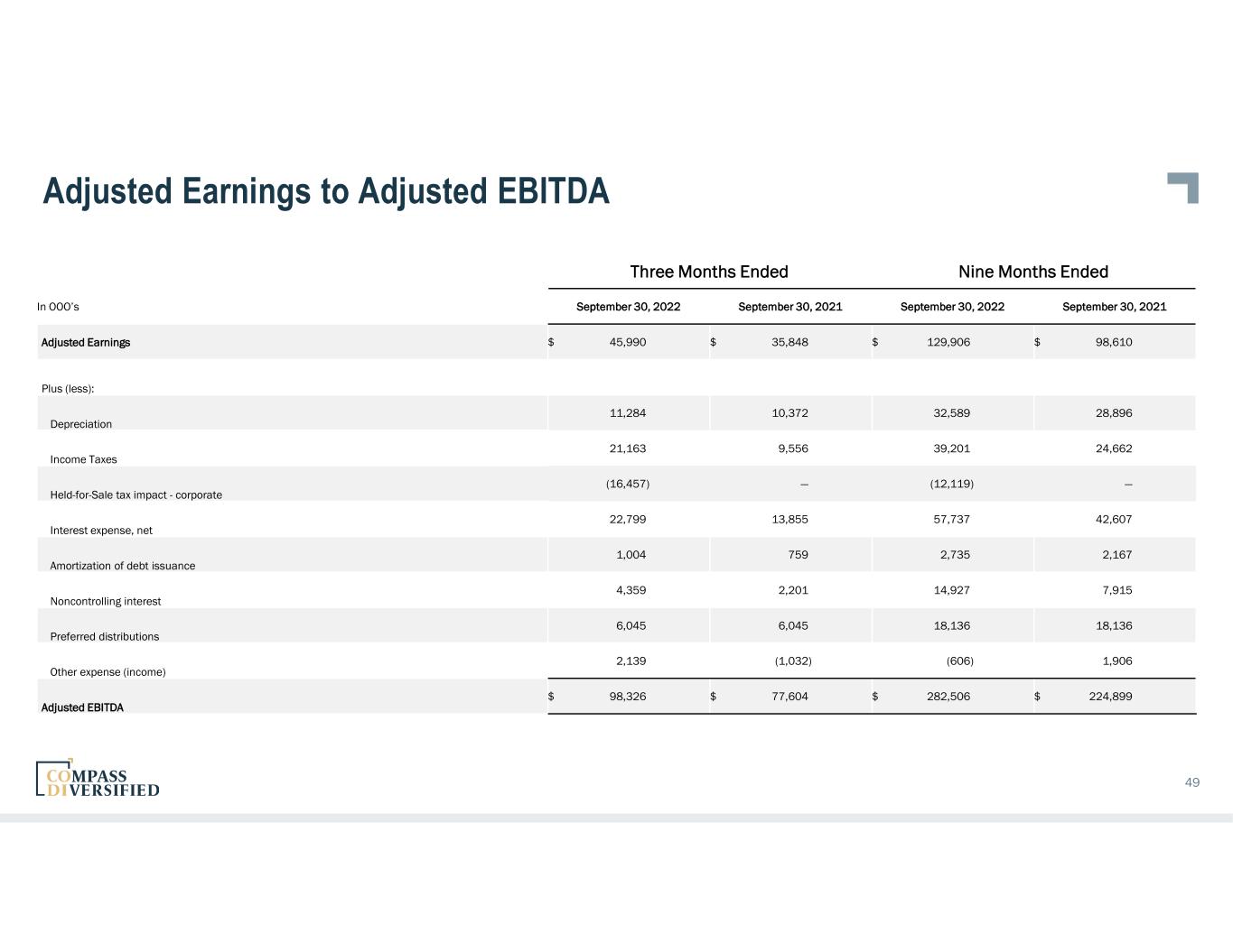Net Income (Loss) to Non-GAAP Adjusted Earnings 48 Three Months Ended Nine Months Ended September 30, 2022 September 30, 2021 September 30, 2022 September 30, 2021 Net income $ 2,585 $ 90,156 $ 63,282 $ 100,901 Gain on sale of discontinued operations 1,479 72,745 6,893 72,745 Income (loss) from discontinued operations, net of tax — (1,309) — 7,665 Net income from continuing operations $ 1,106 $ 18,720 $ 56,389 $ 20,491 Less: income from continuing operations attributable to noncontrolling interest 4,359 2,201 14,927 7,915 Net income (loss) attributable to Holdings - continuing operations $ (3,253) $ 16,519 $ 41,462 $ 12,576 Adjustments: Distributions paid - Preferred Shares (6,045) (6,045) (18,136) (18,136) Amortization expense - intangibles and inventory step up 26,241 19,056 72,092 56,502 Loss on debt extinguishment 534 — 534 33,305 Stock compensation 3,242 2,892 8,851 8,496 Acquisition expenses 5,902 1,866 6,118 2,176 Integration Services Fee 1,625 1,100 2,750 4,300 Held-for-Sale tax impact – corporate 16,457 — 12,119 — Other 1,287 460 4,116 (609) Adjusted Earnings $ 45,990 $ 35,848 $ 129,906 $ 98,610