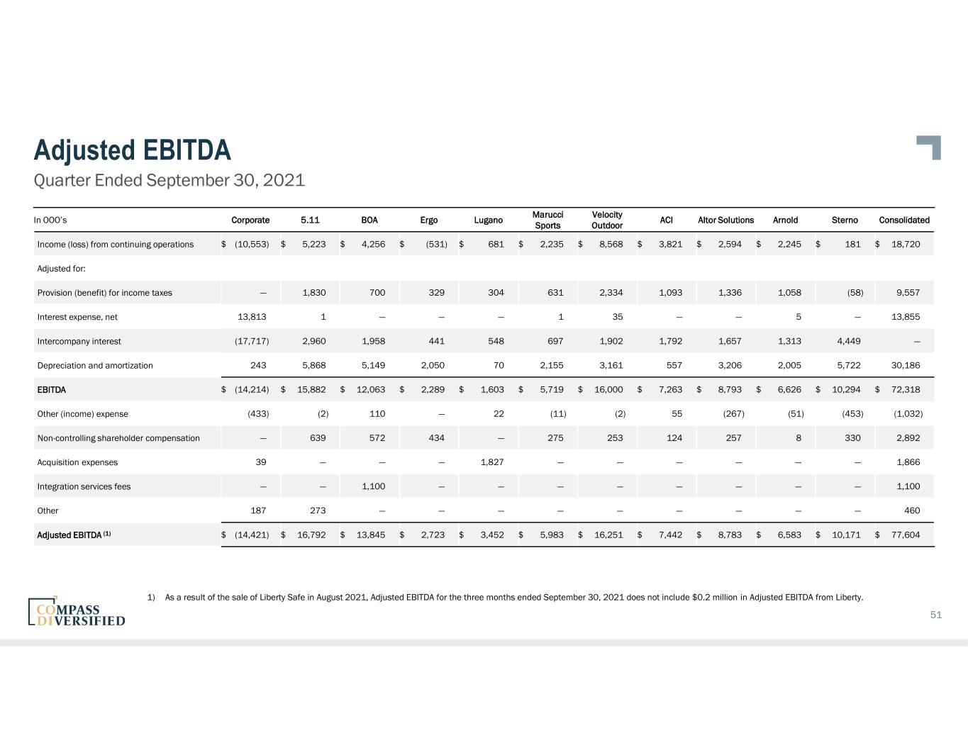 Adjusted EBITDA Quarter Ended September 30, 2022 50 In OOO’s Corporate 5.11 BOA Ergo Lugano Marucci Sports PrimaLoft Velocity Outdoor ACI Altor Solutions Arnold Sterno Consolidated Income (loss) from continuing operations $ (29,950) $ 5,905 $ 8,935 $ (759) $ 8,095 $ 4,230 $ (8,492) $ 4,679 $ 2,426 $ 2,765 $ 3,475 $ (203) $ 1,106 Adjusted for: Provision (benefit) for income taxes 16,457 1,906 1,776 (410) 1,166 1,609 (3,570) 1,416 671 805 537 (1,200) 21,163 Interest expense, net 22,725 2 (7) — 3 3 (4) 70 — — 7 — 22,799 Intercompany interest (28,762) 3,503 1,808 1,737 3,263 1,812 3,251 2,997 1,621 2,821 1,402 4,547 — Loss on debt extinguishment 534 — — — — — — — — — — — 534 Depreciation and amortization expense 285 5,766 5,577 2,033 3,083 2,504 4,194 3,420 538 4,124 1,936 5,069 38,529 EBITDA $ (18,711) $ 17,082 $ 18,089 $ 2,601 $ 15,610 $ 10,158 $ (4,621) $ 12,582 $ 5,256 $ 10,515 $ 7,357 8,213 $ 84,131 Other (income) expense (73) 709 403 — — (1) 260 971 224 110 — (463) 2,140 Non-controlling shareholder compensation — 381 621 362 356 537 — 240 124 375 13 232 3,241 Acquisition expenses — — — — — — 5,680 222 — — — — 5,902 Integration services fee — — — — 562 — 1,063 — — — — — 1,625 Other — — — — — — — — 853 — — 434 1,287 Adjusted EBITDA $ (18,784) $ 18,172 $ 19,113 $ 2,963 $ 16,528 $ 10,694 $ 2,382 $ 14,015 $ 6,457 $ 11,000 $ 7,370 8,416 $ 98,326