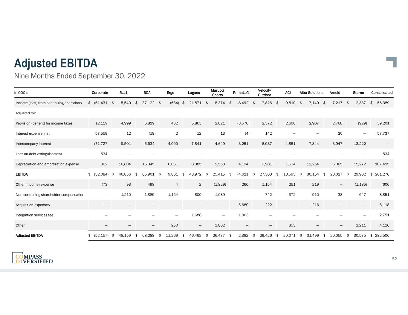 Adjusted EBITDA Quarter Ended September 30, 2021 51 In OOO’s Corporate 5.11 BOA Ergo Lugano Marucci Sports Velocity Outdoor ACI Altor Solutions Arnold Sterno Consolidated Income (loss) from continuing operations $ (10,553) $ 5,223 $ 4,256 $ (531) $ 681 $ 2,235 $ 8,568 $ 3,821 $ 2,594 $ 2,245 $ 181 $ 18,720 Adjusted for: Provision (benefit) for income taxes — 1,830 700 329 304 631 2,334 1,093 1,336 1,058 (58) 9,557 Interest expense, net 13,813 1 — — — 1 35 — — 5 — 13,855 Intercompany interest (17,717) 2,960 1,958 441 548 697 1,902 1,792 1,657 1,313 4,449 — Depreciation and amortization 243 5,868 5,149 2,050 70 2,155 3,161 557 3,206 2,005 5,722 30,186 EBITDA $ (14,214) $ 15,882 $ 12,063 $ 2,289 $ 1,603 $ 5,719 $ 16,000 $ 7,263 $ 8,793 $ 6,626 $ 10,294 $ 72,318 Other (income) expense (433) (2) 110 — 22 (11) (2) 55 (267) (51) (453) (1,032) Non-controlling shareholder compensation — 639 572 434 — 275 253 124 257 8 330 2,892 Acquisition expenses 39 — — — 1,827 — — — — — — 1,866 Integration services fees — — 1,100 — — — — — — — — 1,100 Other 187 273 — — — — — — — — — 460 Adjusted EBITDA (1) $ (14,421) $ 16,792 $ 13,845 $ 2,723 $ 3,452 $ 5,983 $ 16,251 $ 7,442 $ 8,783 $ 6,583 $ 10,171 $ 77,604 1) As a result of the sale of Liberty Safe in August 2021, Adjusted EBITDA for the three months ended September 30, 2021 does not include $0.2 million in Adjusted EBITDA from Liberty.