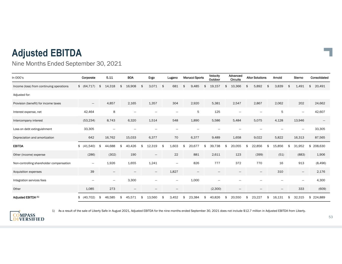 Adjusted EBITDA Nine Months Ended September 30, 2022 52 In OOO’s Corporate 5.11 BOA Ergo Lugano Marucci Sports PrimaLoft Velocity Outdoor ACI Altor Solutions Arnold Sterno Consolidated Income (loss) from continuing operations $ (51,431) $ 15,540 $ 37,122 $ (634) $ 21,871 $ 8,374 $ (8,492) $ 7,826 $ 9,510 $ 7,149 $ 7,217 $ 2,337 $ 56,389 Adjusted for: Provision (benefit) for income taxes 12,119 4,999 6,819 432 5,863 2,821 (3,570) 2,372 2,600 2,907 2,768 (929) 39,201 Interest expense, net 57,559 12 (19) 2 12 13 (4) 142 — — 20 — 57,737 Intercompany interest (71,727) 9,501 5,634 4,000 7,841 4,649 3,251 6,987 4,851 7,844 3,947 13,222 — Loss on debt extinguishment 534 — — — — — — — — — — — 534 Depreciation and amortization expense 862 16,804 16,345 6,061 8,385 9,558 4,194 9,981 1,634 12,254 6,065 15,272 107,415 EBITDA $ (52,084) $ 46,856 $ 65,901 $ 9,861 $ 43,972 $ 25,415 $ (4,621) $ 27,308 $ 18,595 $ 30,154 $ 20,017 $ 29,902 $ 261,276 Other (income) expense (73) 93 498 4 2 (1,829) 260 1,154 251 219 — (1,185) (606) Non-controlling shareholder compensation — 1,210 1,889 1,154 800 1,089 — 742 372 910 38 647 8,851 Acquisition expenses — — — — — — 5,680 222 — 216 — — 6,118 Integration services fee — — — — 1,688 — 1,063 — — — — — 2,751 Other — — — 250 — 1,802 — — 853 — — 1,211 4,116 Adjusted EBITDA $ (52,157) $ 48,159 $ 68,288 $ 11,269 $ 46,462 $ 26,477 $ 2,382 $ 29,426 $ 20,071 $ 31,499 $ 20,055 $ 30,575 $ 282,506