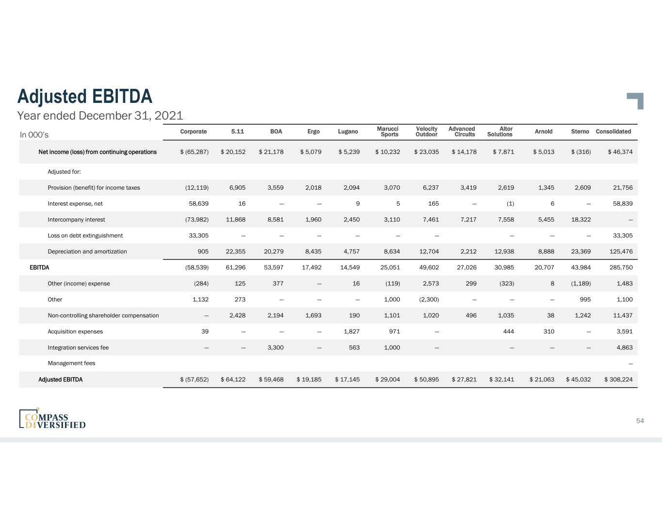 Adjusted EBITDA Year ended December 31, 2021 Corporate 5.11 BOA Ergo Lugano Marucci Sports Velocity Outdoor Advanced Circuits Altor Solutions Arnold Sterno Consolidated Net income (loss) from continuing operations $ (65,287) $ 20,152 $ 21,178 $ 5,079 $ 5,239 $ 10,232 $ 23,035 $ 14,178 $ 7,871 $ 5,013 $ (316) $ 46,374 Adjusted for: Provision (benefit) for income taxes (12,119) 6,905 3,559 2,018 2,094 3,070 6,237 3,419 2,619 1,345 2,609 21,756 Interest expense, net 58,639 16 — — 9 5 165 — (1) 6 — 58,839 Intercompany interest (73,982) 11,868 8,581 1,960 2,450 3,110 7,461 7,217 7,558 5,455 18,322 — Loss on debt extinguishment 33,305 — — — — — — — — — 33,305 Depreciation and amortization 905 22,355 20,279 8,435 4,757 8,634 12,704 2,212 12,938 8,888 23,369 125,476 EBITDA (58,539) 61,296 53,597 17,492 14,549 25,051 49,602 27,026 30,985 20,707 43,984 285,750 Other (income) expense (284) 125 377 — 16 (119) 2,573 299 (323) 8 (1,189) 1,483 Other 1,132 273 — — — 1,000 (2,300) — — — 995 1,100 Non-controlling shareholder compensation — 2,428 2,194 1,693 190 1,101 1,020 496 1,035 38 1,242 11,437 Acquisition expenses 39 — — — 1,827 971 — 444 310 — 3,591 Integration services fee — — 3,300 — 563 1,000 — — — — 4,863 Management fees — Adjusted EBITDA $ (57,652) $ 64,122 $ 59,468 $ 19,185 $ 17,145 $ 29,004 $ 50,895 $ 27,821 $ 32,141 $ 21,063 $ 45,032 $ 308,224 54 In 000’s