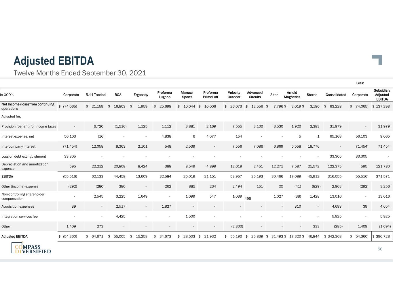Adjusted EBITDA Twelve Months Ended September 30, 2022 57 Less: In OOO’s Corporate 5.11 Tactical BOA Ergobaby Lugano Marucci Sports Proforma PrimaLoft Velocity Outdoor Advanced Circuits Altor Arnold Magnetics Sterno Consolidated Corporate Adjusted EBITDA Net Income (loss) from continuing operations $ (52,001) $ 21,374 $ 41,392 $ 1,374 $ 26,429 $ 9,121 $ 4,876 $ 11,704 $ 13,322 $ 9,128 $ 8,391 $ 530 $ 95,640 $ (52,001) $ 147,641 Adjusted for: Provision (benefit) for income taxes - 7,047 8,213 1,093 7,653 2,971 875 3,228 3,472 2,659 2,051 1,478 40,740 - 40,740 Interest expense, net 73,734 20 (19) 2 21 13 5,829 182 - (1) 21 - 79,802 73,734 6,068 Intercompany interest (92,475) 12,626 7,895 4,446 9,743 5,869 3,251 8,862 6,584 10,327 5,274 17,598 (0) (92,475) 92,475 Loss on debt extinguishment 534 - - - - - - - - - - - 534 534 - Depreciation and amortization expense 1,125 22,397 21,591 8,119 13,072 11,815 8,028 13,196 2,188 16,170 9,131 22,328 149,160 1,125 148,035 EBITDA (69,083) 63,464 79,072 15,034 56,918 29,789 22,859 37,172 25,565 38,283 24,868 41,934 365,875 (69,083) 434,958 Other (income) expense (71) 520 685 4 (4) (2,829) 1,498 1,116 426 293 59 (1,491) 207 (71) 278 Non-controlling shareholder compensation - 1,712 2,428 1,606 990 1,364 481 985 496 1,175 60 976 12,273 - 12,273 Acquisition expenses - - - - - 971 5,680 222 - 660 - - 7,533 - 7,533 Integration services fee - - - - 2,251 - 1,063 - - - - - 3,313 - 3,313 Other 47 - - 250 - 2,802 - - 853 - - 1,873 5,825 47 5,778 Adjusted EBITDA $ (69,107) $ 65,696 $ 82,185 $ 16,894 $ 60,154 $ 32,097 $ 31,581 $ 39,495 $ 27,341 $ 40,411 $ 24,987 $ 43,292 $ 395,026 $ (69,107) $ 464,133