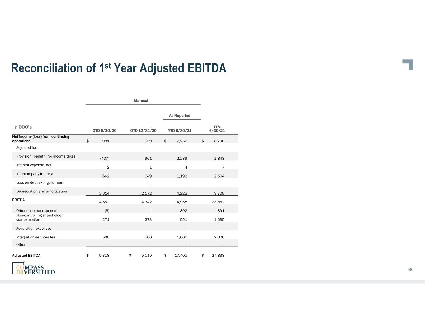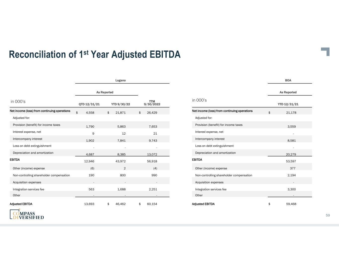 Reconciliation of 1st Year Adjusted EBITDA Lugano As Reported in 000’s QTD 12/31/21 YTD 9/30/22 TTM 9/30/2022 Net income (loss) from continuing operations $ 4,558 $ 21,871 $ 26,429 Adjusted for: Provision (benefit) for income taxes 1,790 5,863 7,653 Interest expense, net 9 12 21 Intercompany interest 1,902 7,841 9,743 Loss on debt extinguishment - - - Depreciation and amortization 4,687 8,385 13,072 EBITDA 12,946 43,972 56,918 Other (income) expense (6) 2 (4) Non-controlling shareholder compensation 190 800 990 Acquisition expenses - - - Integration services fee 563 1,688 2,251 Other - - - Adjusted EBITDA 13,693 $ 46,462 $ 60,154 59 in 000’s BOA As Reported YTD 12/31/21 Net income (loss) from continuing operations $ 21,178 Adjusted for: Provision (benefit) for income taxes 3,559 Interest expense, net - Intercompany interest 8,581 Loss on debt extinguishment - Depreciation and amortization 20,279 EBITDA 53,597 Other (income) expense 377 Non-controlling shareholder compensation 2,194 Acquisition expenses - Integration services fee 3,300 Other - Adjusted EBITDA $ 59,468